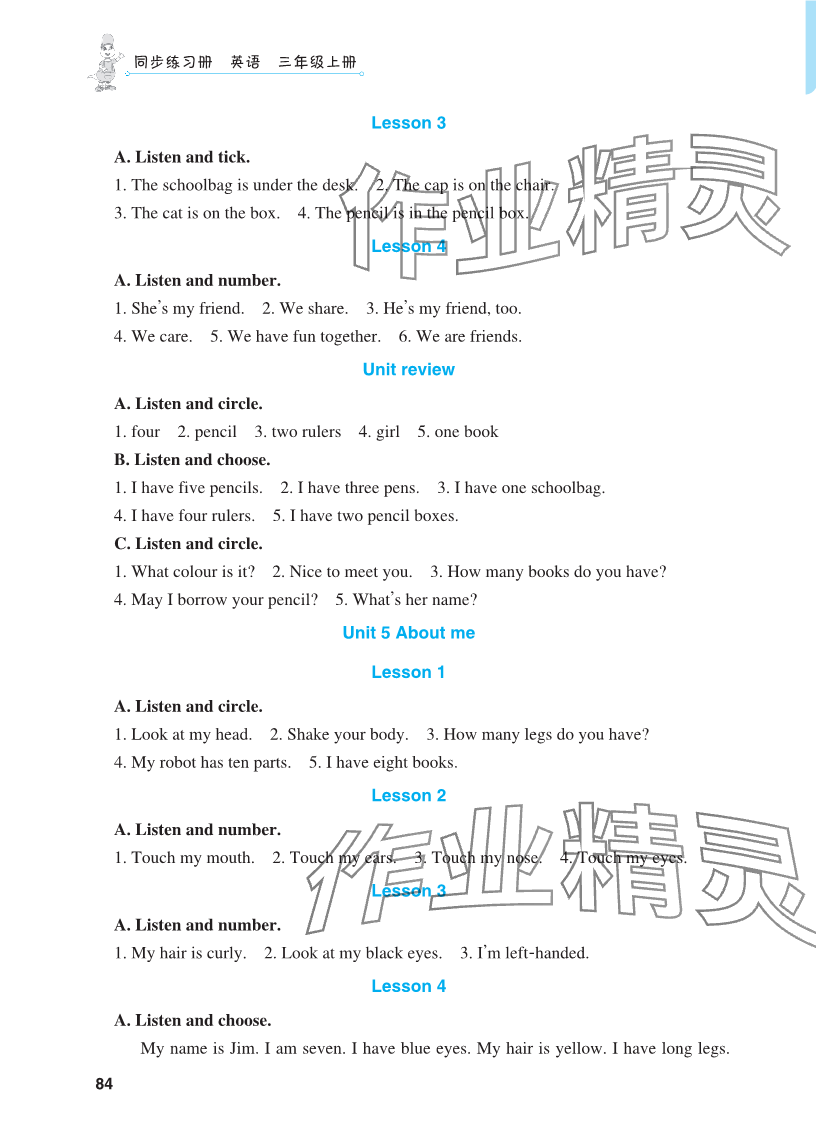 注:目前有些书本章节名称可能整理的还不是很完善,但都是按照顺序排列的,请同学们按照顺序仔细查找。练习册 2024年同步练习册河北教育出版社三年级英语上册冀教版 答案主要是用来给同学们做完题方便对答案用的,请勿直接抄袭。