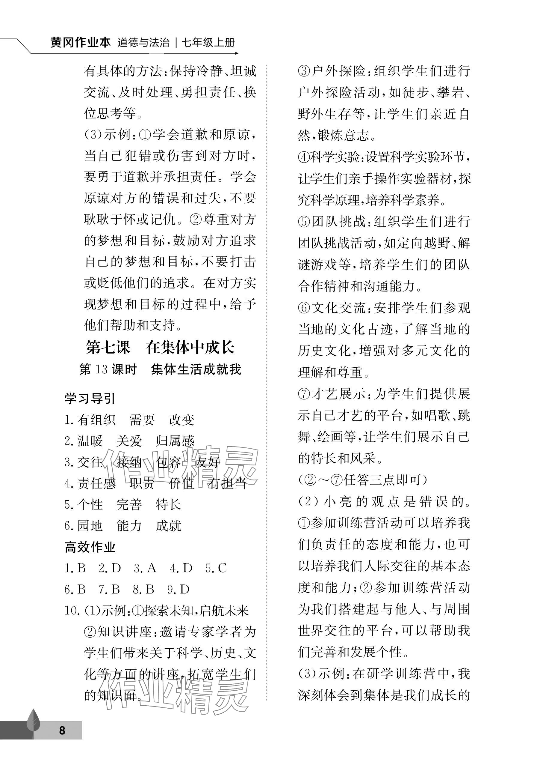 注:目前有些书本章节名称可能整理的还不是很完善,但都是按照顺序排列的,请同学们按照顺序仔细查找。练习册 2024年黄冈作业本武汉大学出版社七年级道德与法治上册人教版 答案主要是用来给同学们做完题方便对答案用的,请勿直接抄袭。