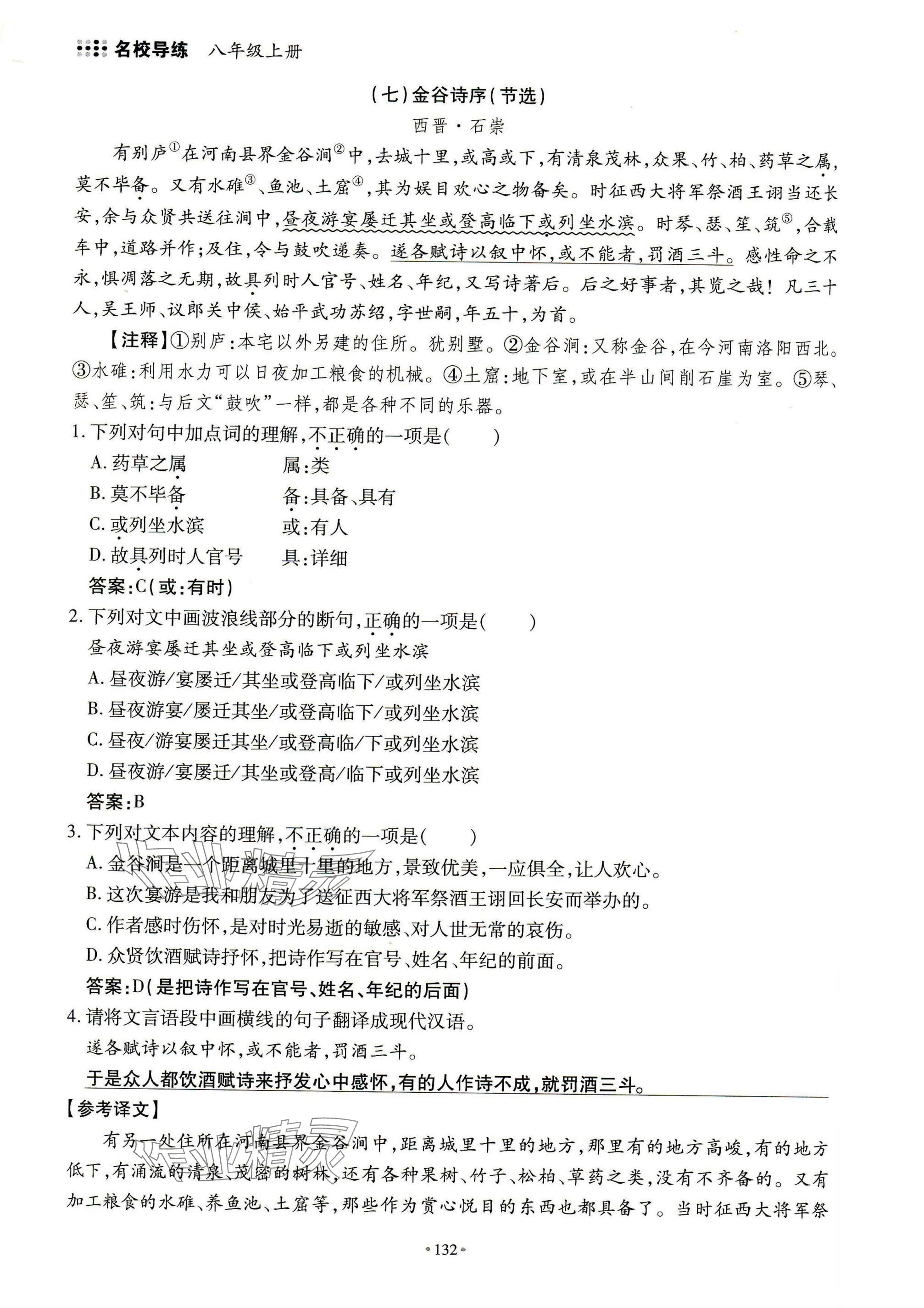 注:目前有些书本章节名称可能整理的还不是很完善,但都是按照顺序排列的,请同学们按照顺序仔细查找。练习册 2024年名校导练八年级语文上册人教版 答案主要是用来给同学们做完题方便对答案用的,请勿直接抄袭。