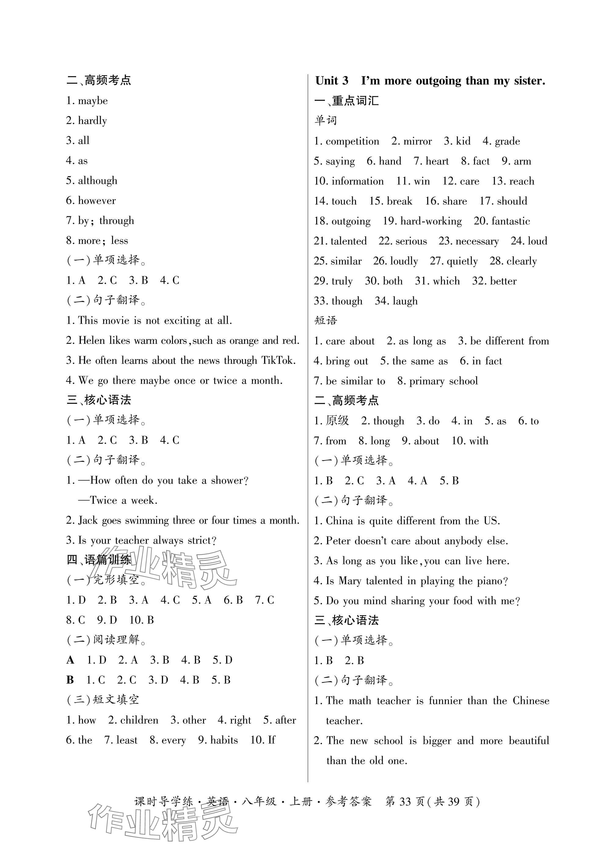 注:目前有些书本章节名称可能整理的还不是很完善,但都是按照顺序排列的,请同学们按照顺序仔细查找。练习册 2024年课时导学练八年级英语上册人教版广东专版 答案主要是用来给同学们做完题方便对答案用的,请勿直接抄袭。
