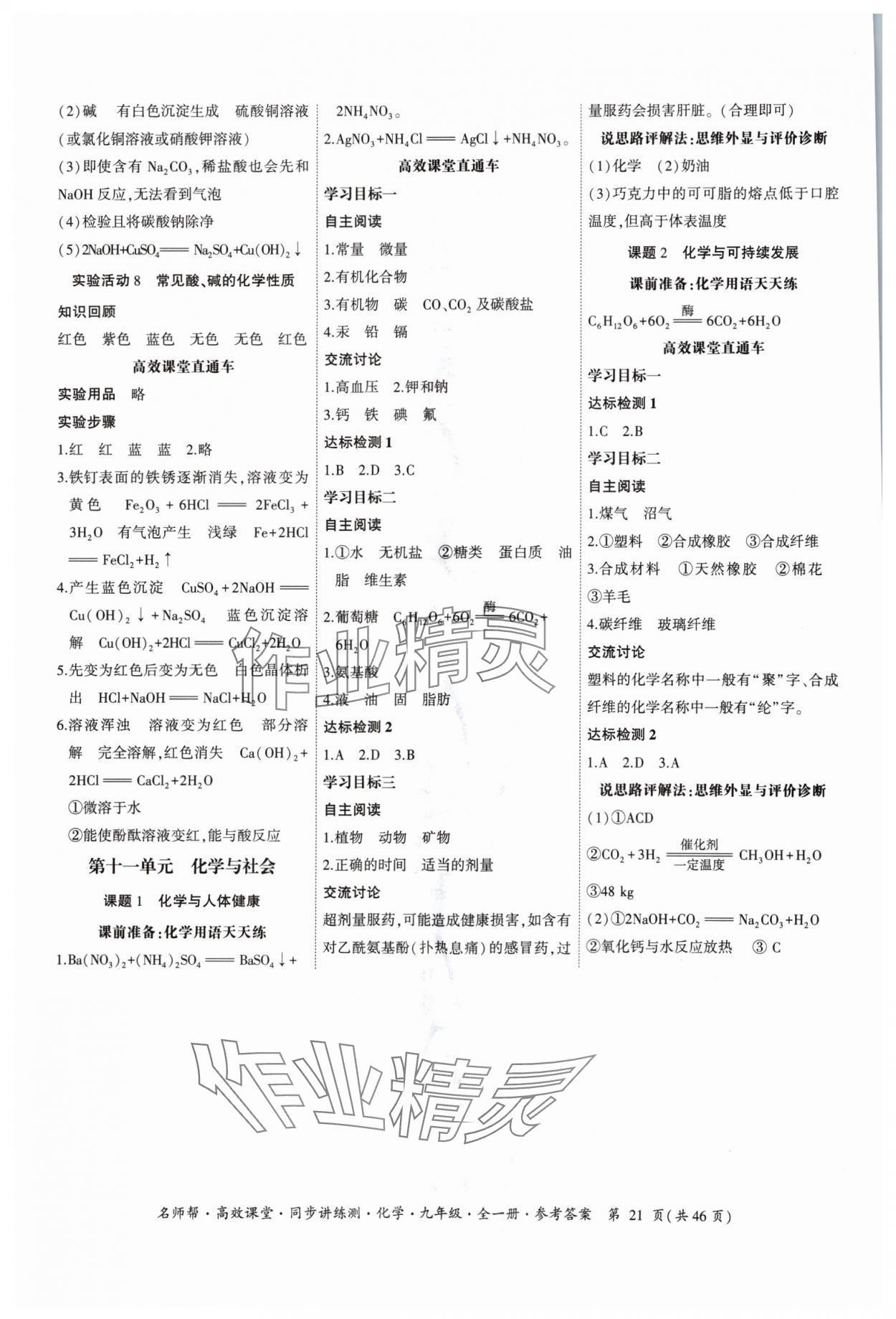 注:目前有些书本章节名称可能整理的还不是很完善,但都是按照顺序排列的,请同学们按照顺序仔细查找。练习册 2024年名师帮高效课堂同步讲练测九年级化学全一册人教版 答案主要是用来给同学们做完题方便对答案用的,请勿直接抄袭。