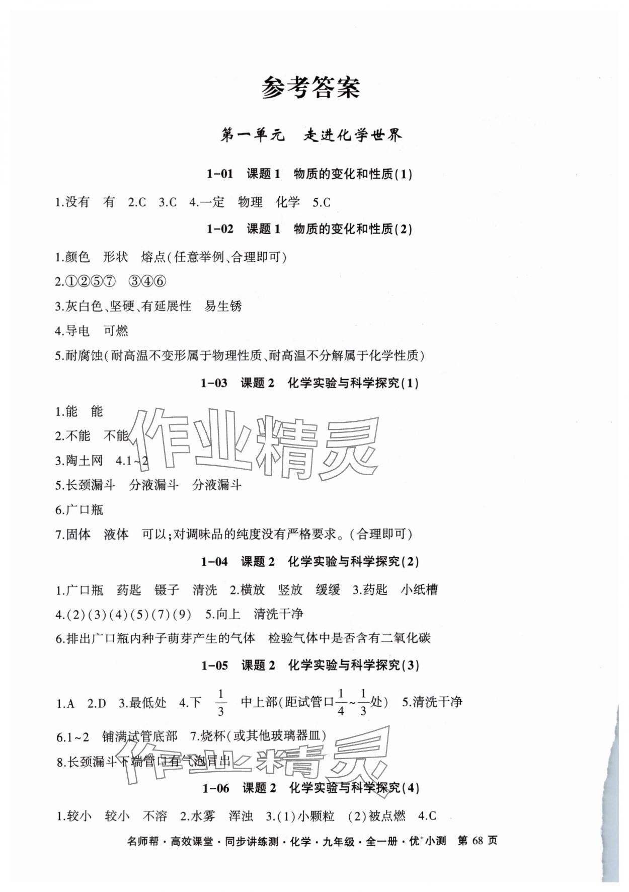注:目前有些书本章节名称可能整理的还不是很完善,但都是按照顺序排列的,请同学们按照顺序仔细查找。练习册 2024年名师帮高效课堂同步讲练测九年级化学全一册人教版 答案主要是用来给同学们做完题方便对答案用的,请勿直接抄袭。