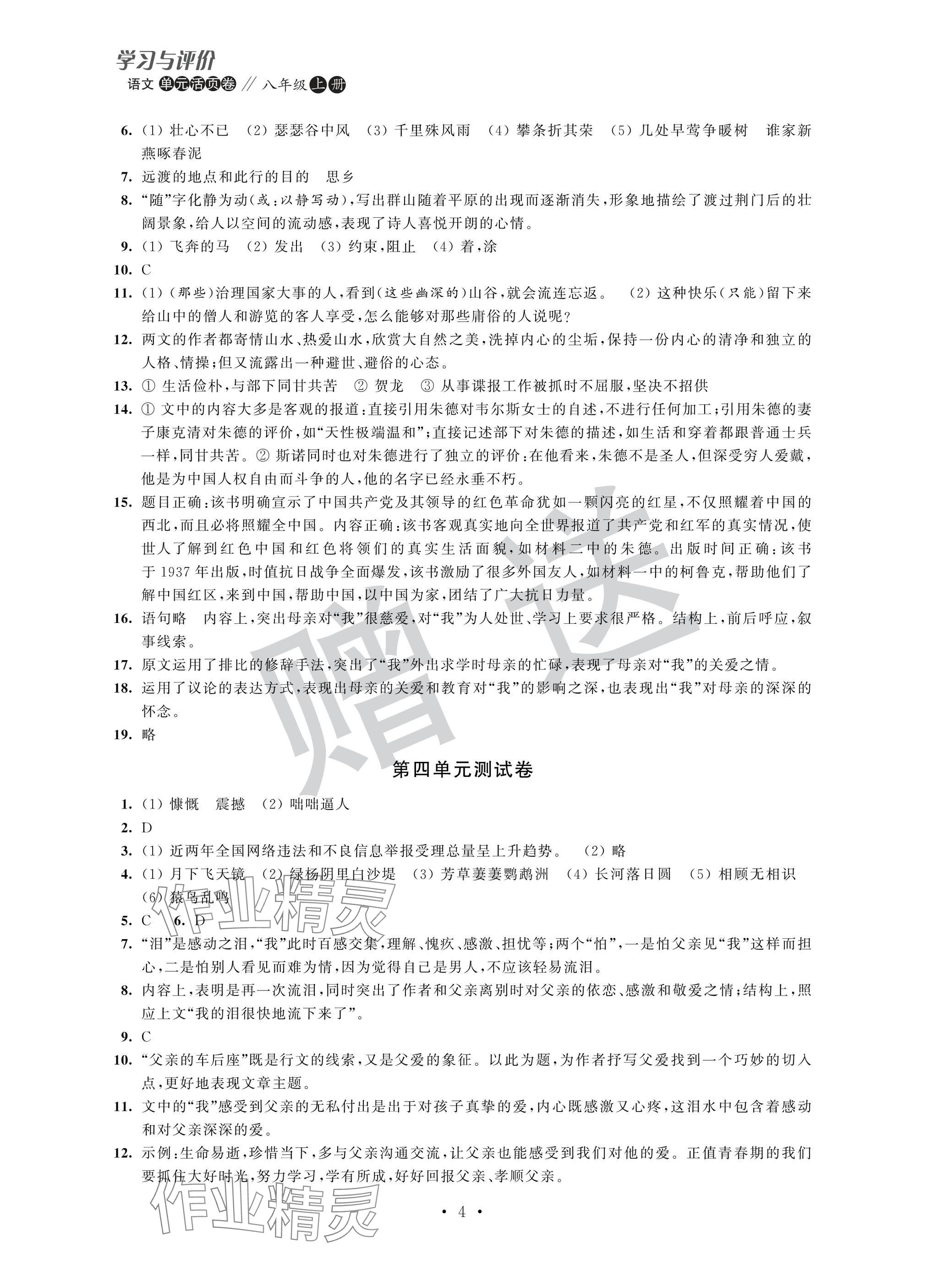 注:目前有些书本章节名称可能整理的还不是很完善,但都是按照顺序排列的,请同学们按照顺序仔细查找。练习册 2024年学习与评价活页卷八年级语文上册人教版 答案主要是用来给同学们做完题方便对答案用的,请勿直接抄袭。