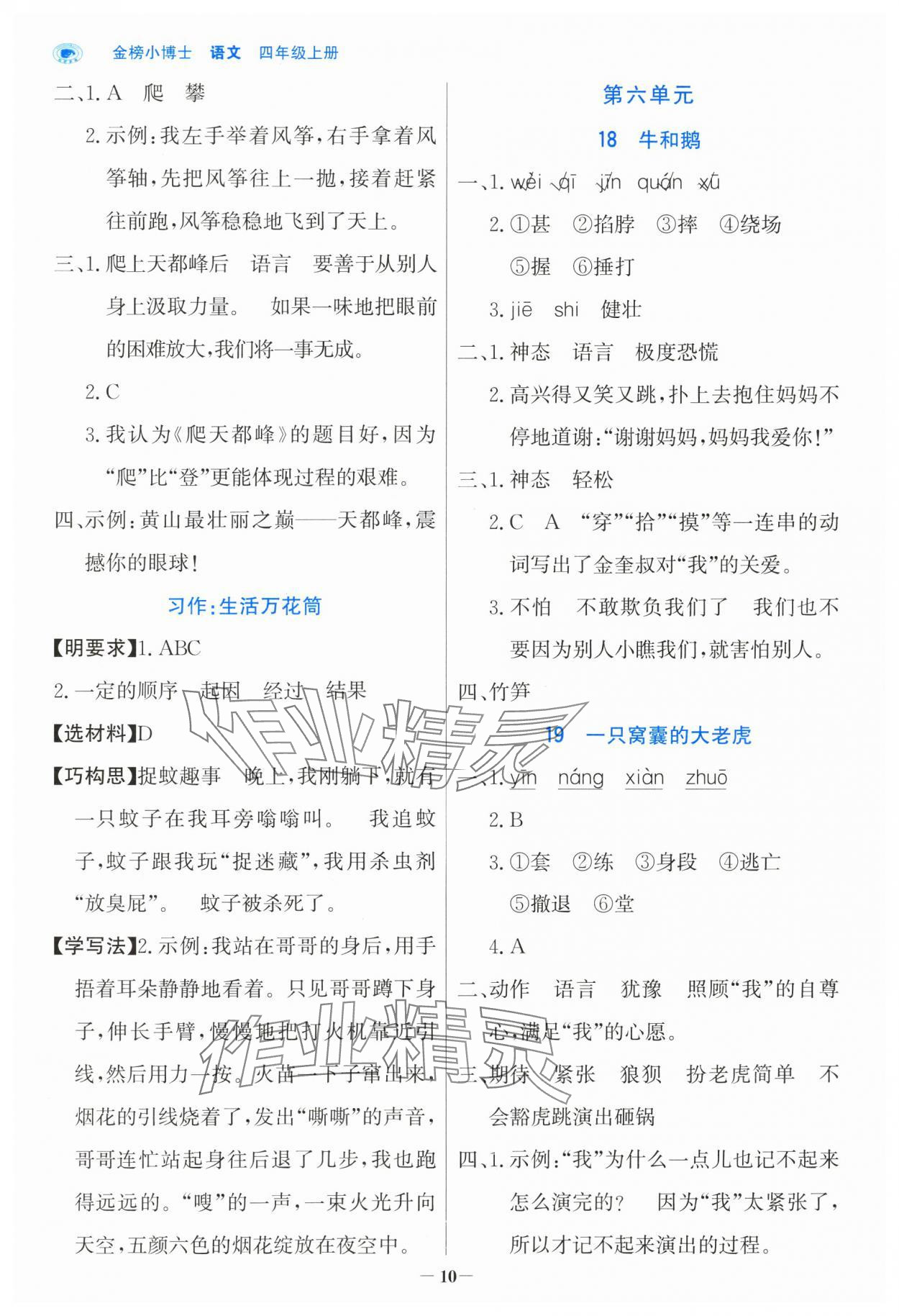 注:目前有些书本章节名称可能整理的还不是很完善,但都是按照顺序排列的,请同学们按照顺序仔细查找。练习册 2024年世纪金榜金榜小博士四年级语文上册人教版 答案主要是用来给同学们做完题方便对答案用的,请勿直接抄袭。