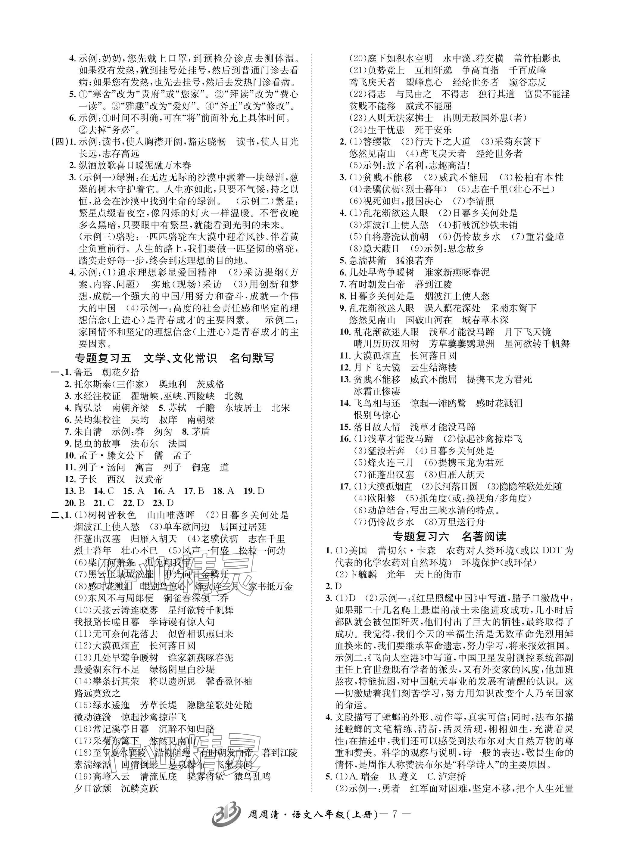 注:目前有些书本章节名称可能整理的还不是很完善,但都是按照顺序排列的,请同学们按照顺序仔细查找。练习册 2024年周周清检测八年级语文上册人教版 答案主要是用来给同学们做完题方便对答案用的,请勿直接抄袭。