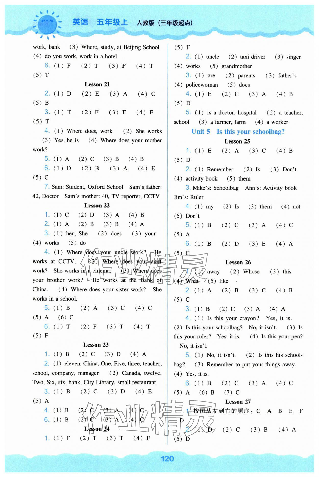 注:目前有些书本章节名称可能整理的还不是很完善,但都是按照顺序排列的,请同学们按照顺序仔细查找。练习册 2024年新课程能力培养五年级英语上册人教版三起 答案主要是用来给同学们做完题方便对答案用的,请勿直接抄袭。