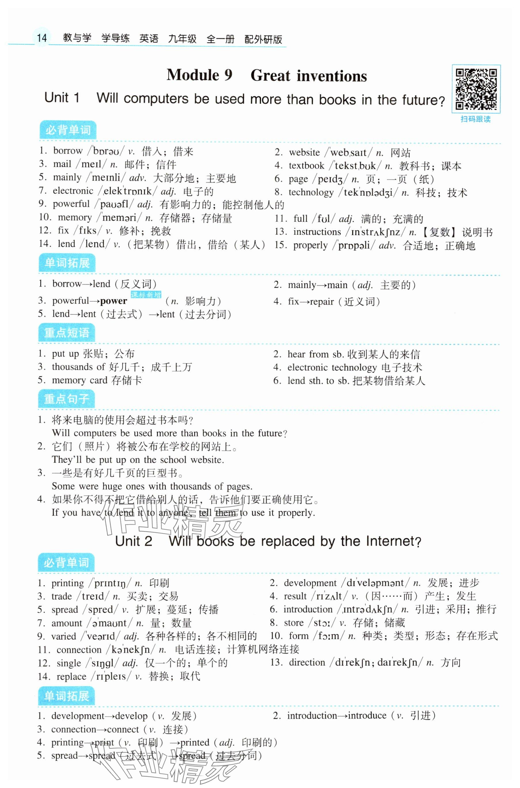 注:目前有些书本章节名称可能整理的还不是很完善,但都是按照顺序排列的,请同学们按照顺序仔细查找。练习册 2024年教与学学导练九年级英语全一册外研版 答案主要是用来给同学们做完题方便对答案用的,请勿直接抄袭。