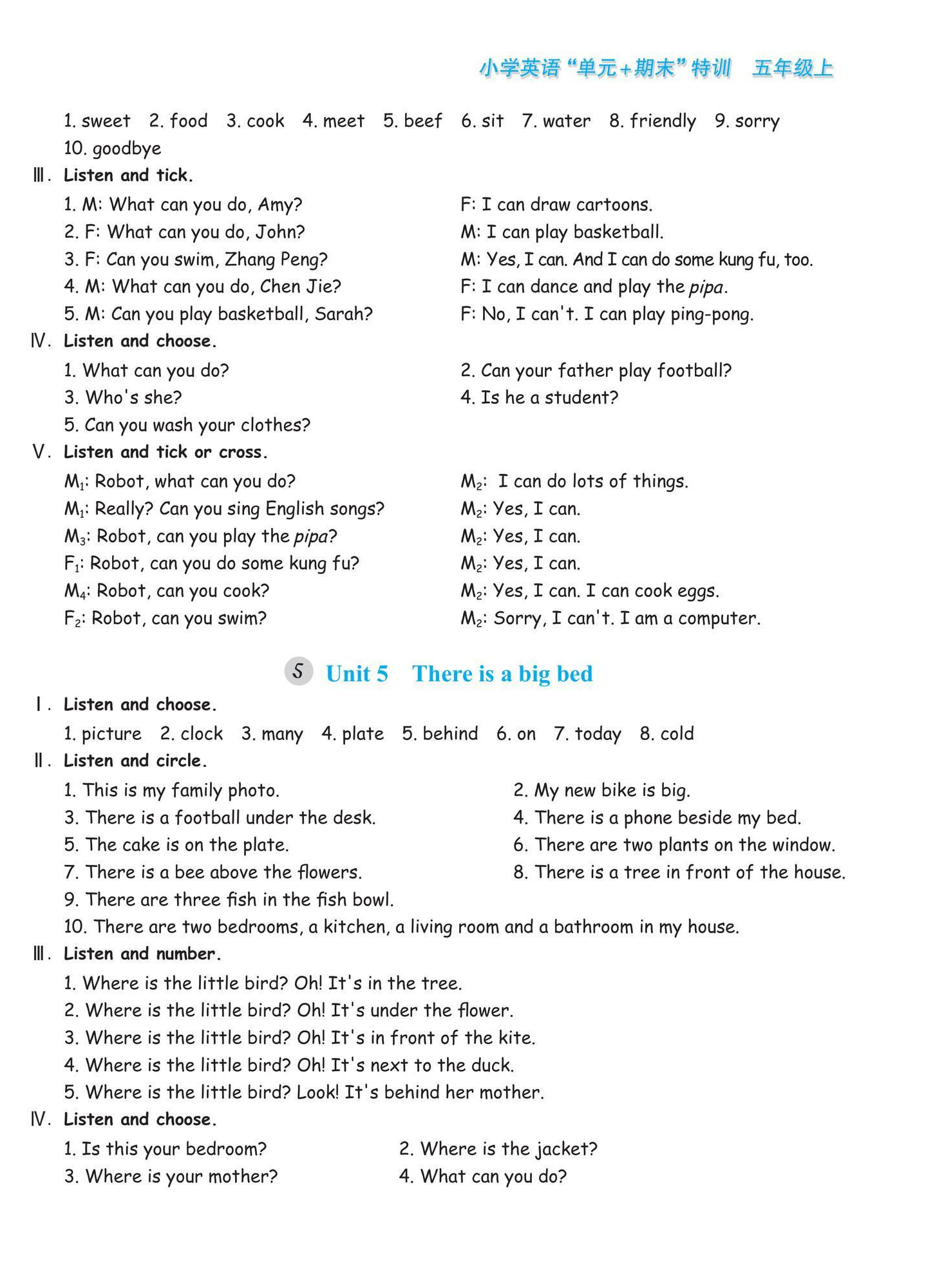 注:目前有些书本章节名称可能整理的还不是很完善,但都是按照顺序排列的,请同学们按照顺序仔细查找。练习册 2024年单元加期末特训五年级英语上册人教版 答案主要是用来给同学们做完题方便对答案用的,请勿直接抄袭。