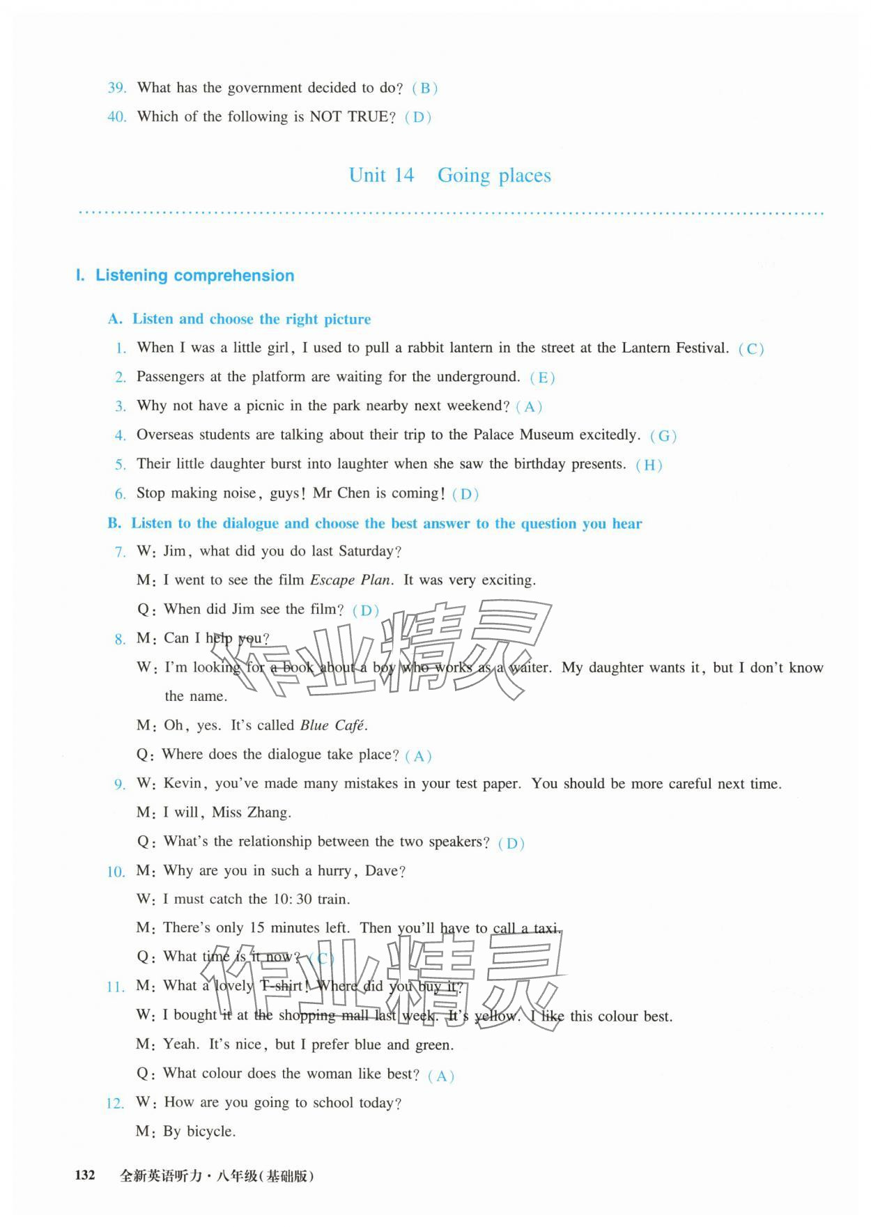 注:目前有些书本章节名称可能整理的还不是很完善,但都是按照顺序排列的,请同学们按照顺序仔细查找。练习册 2024年全新英语听力八年级上册沪教版五四制 答案主要是用来给同学们做完题方便对答案用的,请勿直接抄袭。
