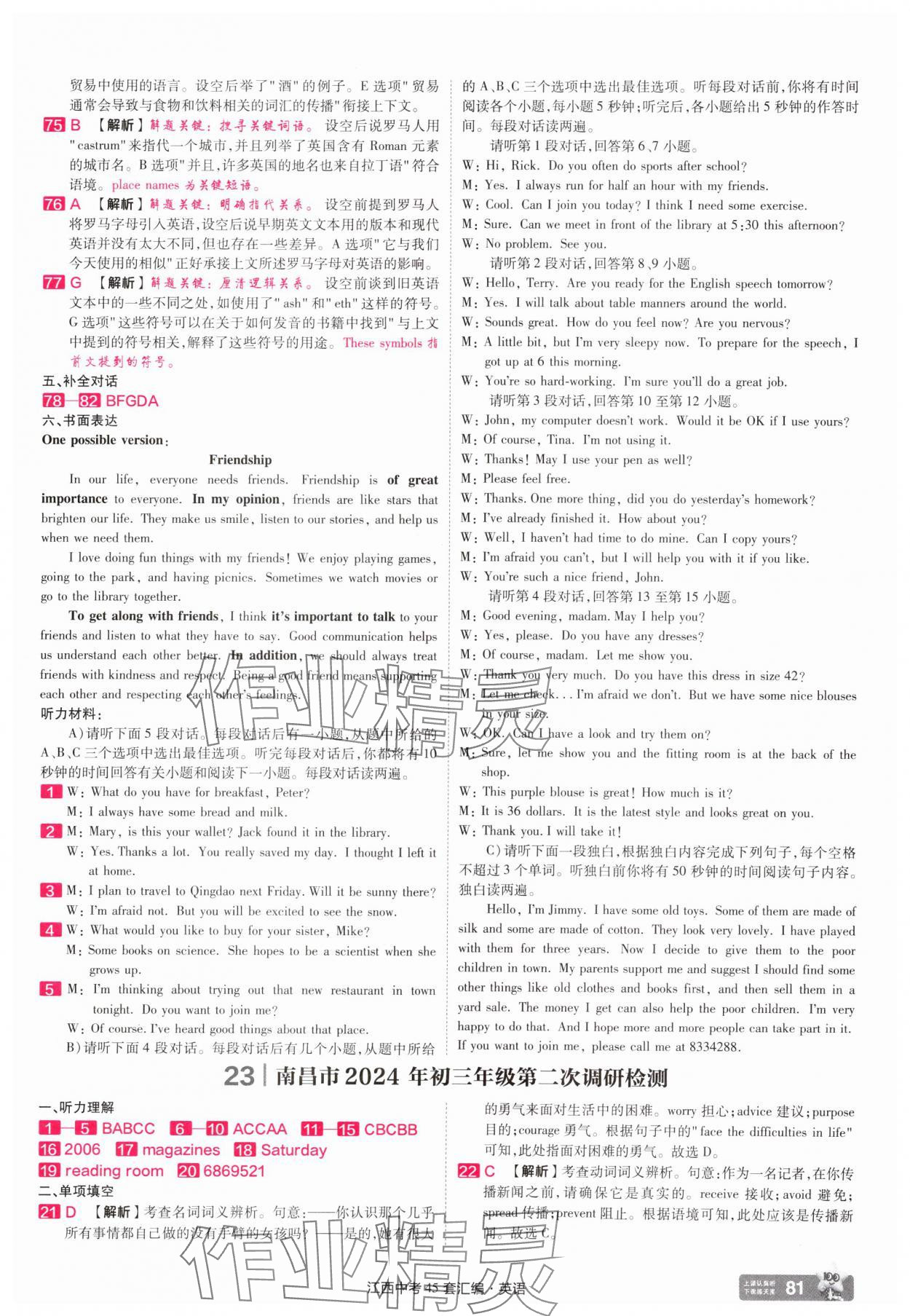 注:目前有些书本章节名称可能整理的还不是很完善,但都是按照顺序排列的,请同学们按照顺序仔细查找。练习册 2025年金考卷中考45套汇编英语江西专版 答案主要是用来给同学们做完题方便对答案用的,请勿直接抄袭。