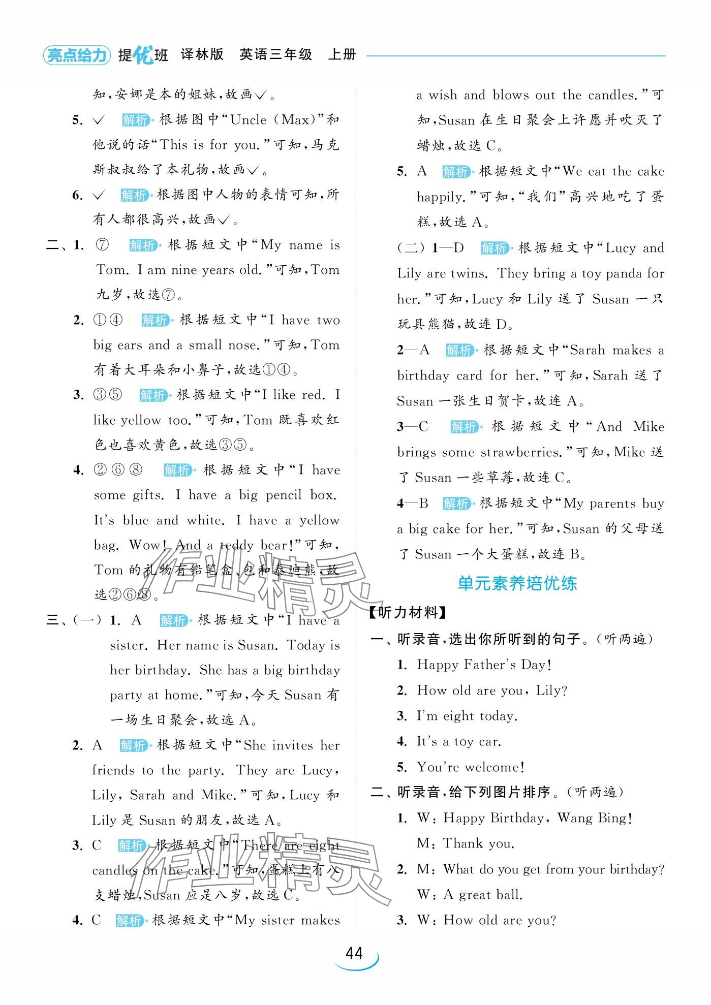 注:目前有些书本章节名称可能整理的还不是很完善,但都是按照顺序排列的,请同学们按照顺序仔细查找。练习册 2024年亮点给力提优班三年级英语上册译林版 答案主要是用来给同学们做完题方便对答案用的,请勿直接抄袭。