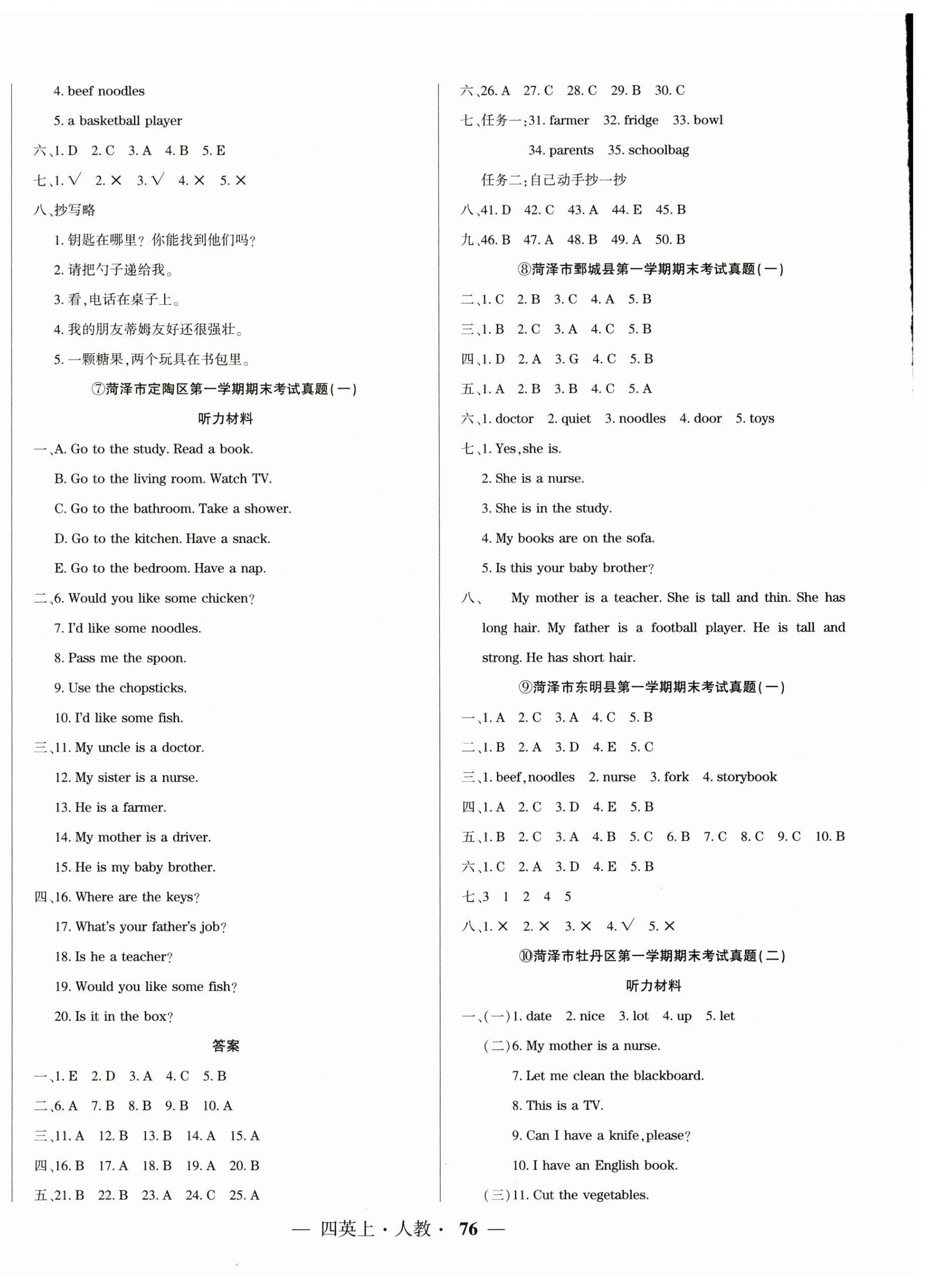 注:目前有些书本章节名称可能整理的还不是很完善,但都是按照顺序排列的,请同学们按照顺序仔细查找。练习册 2024年金牌期末好卷四年级英语上册人教版菏泽专版 答案主要是用来给同学们做完题方便对答案用的,请勿直接抄袭。