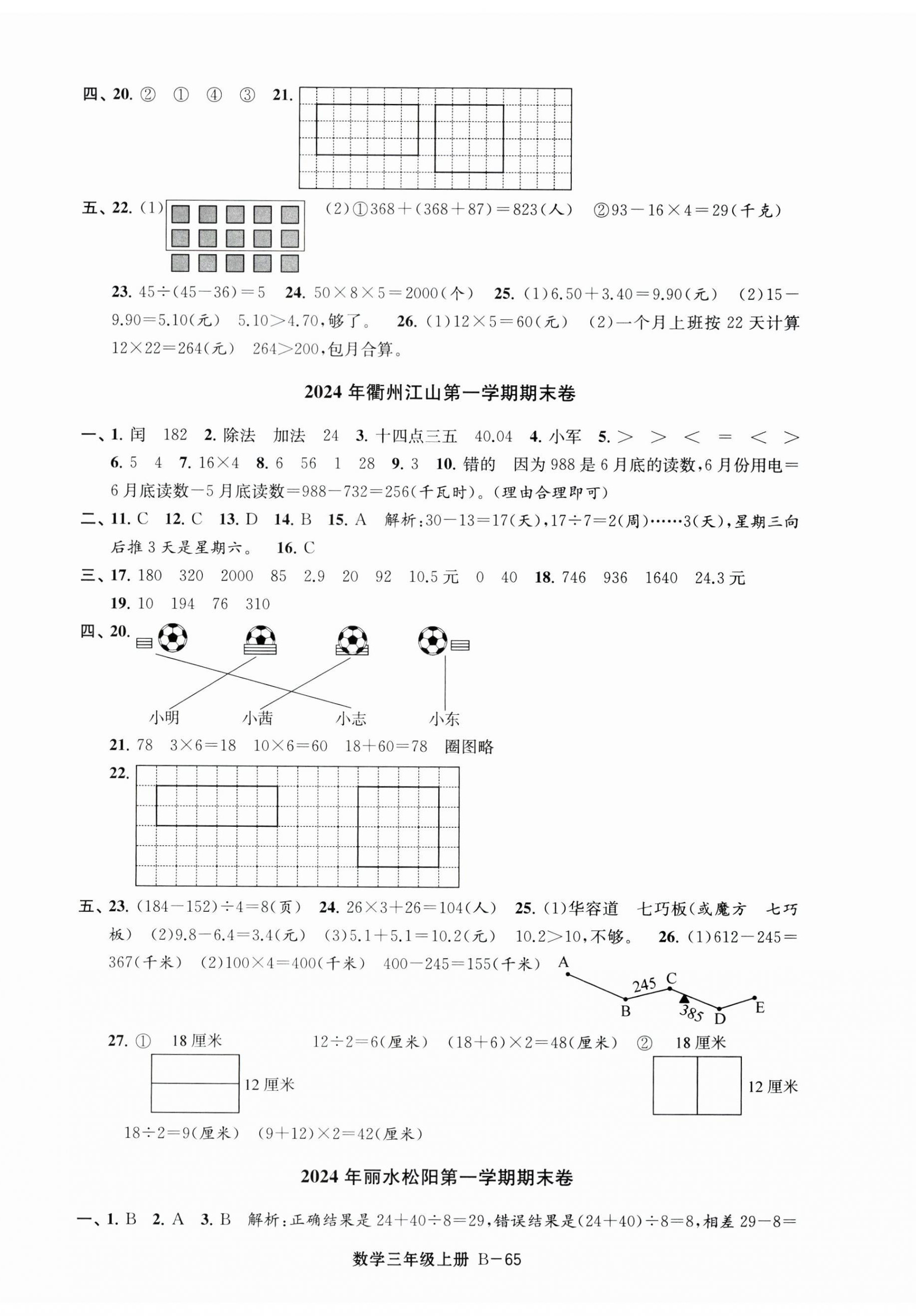注:目前有些书本章节名称可能整理的还不是很完善,但都是按照顺序排列的,请同学们按照顺序仔细查找。练习册 2024年浙江各地期末迎考卷三年级数学上册北师大版 答案主要是用来给同学们做完题方便对答案用的,请勿直接抄袭。
