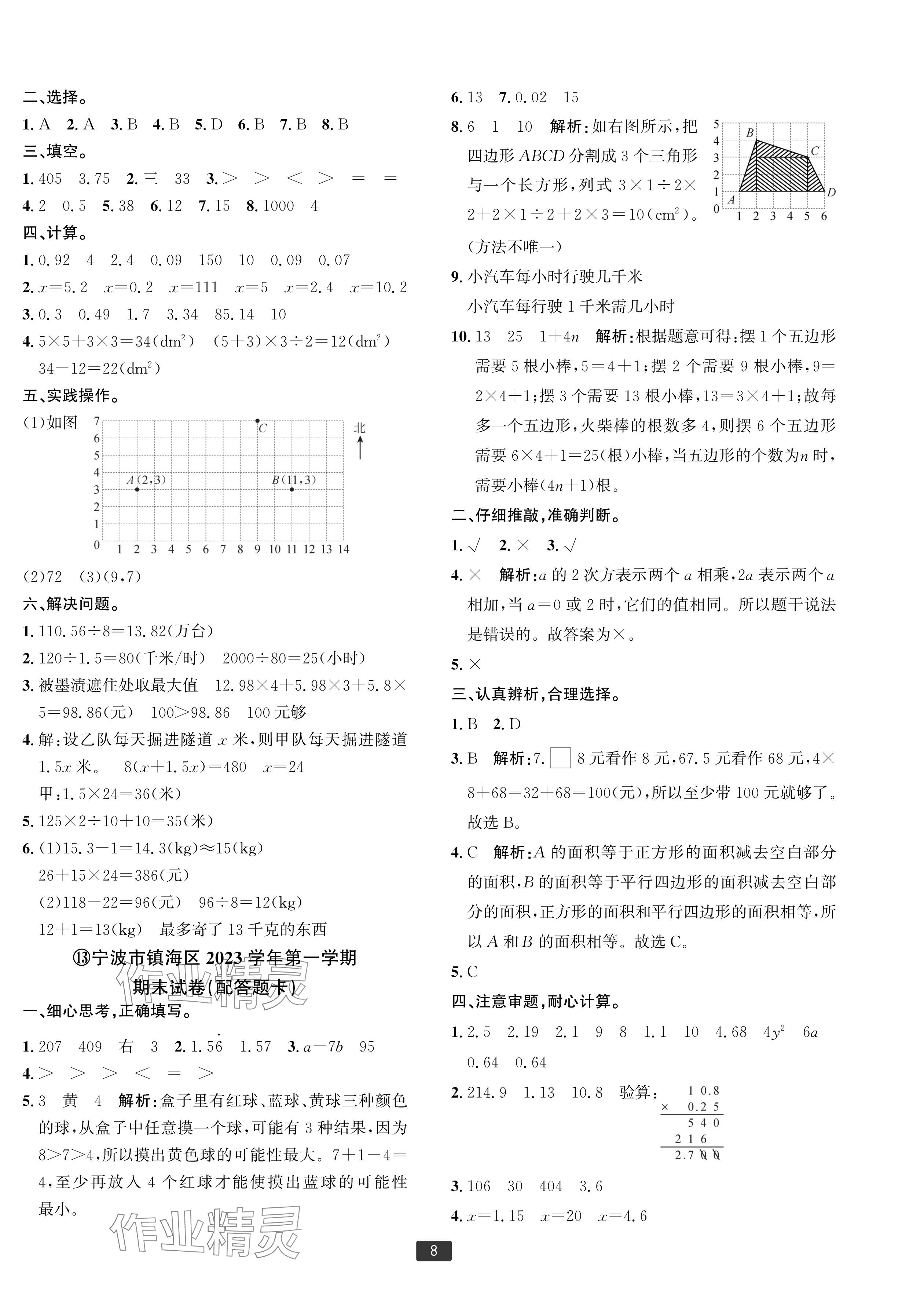 注:目前有些书本章节名称可能整理的还不是很完善,但都是按照顺序排列的,请同学们按照顺序仔细查找。练习册 2024年浙江新期末五年级数学上册人教版宁波专版 答案主要是用来给同学们做完题方便对答案用的,请勿直接抄袭。
