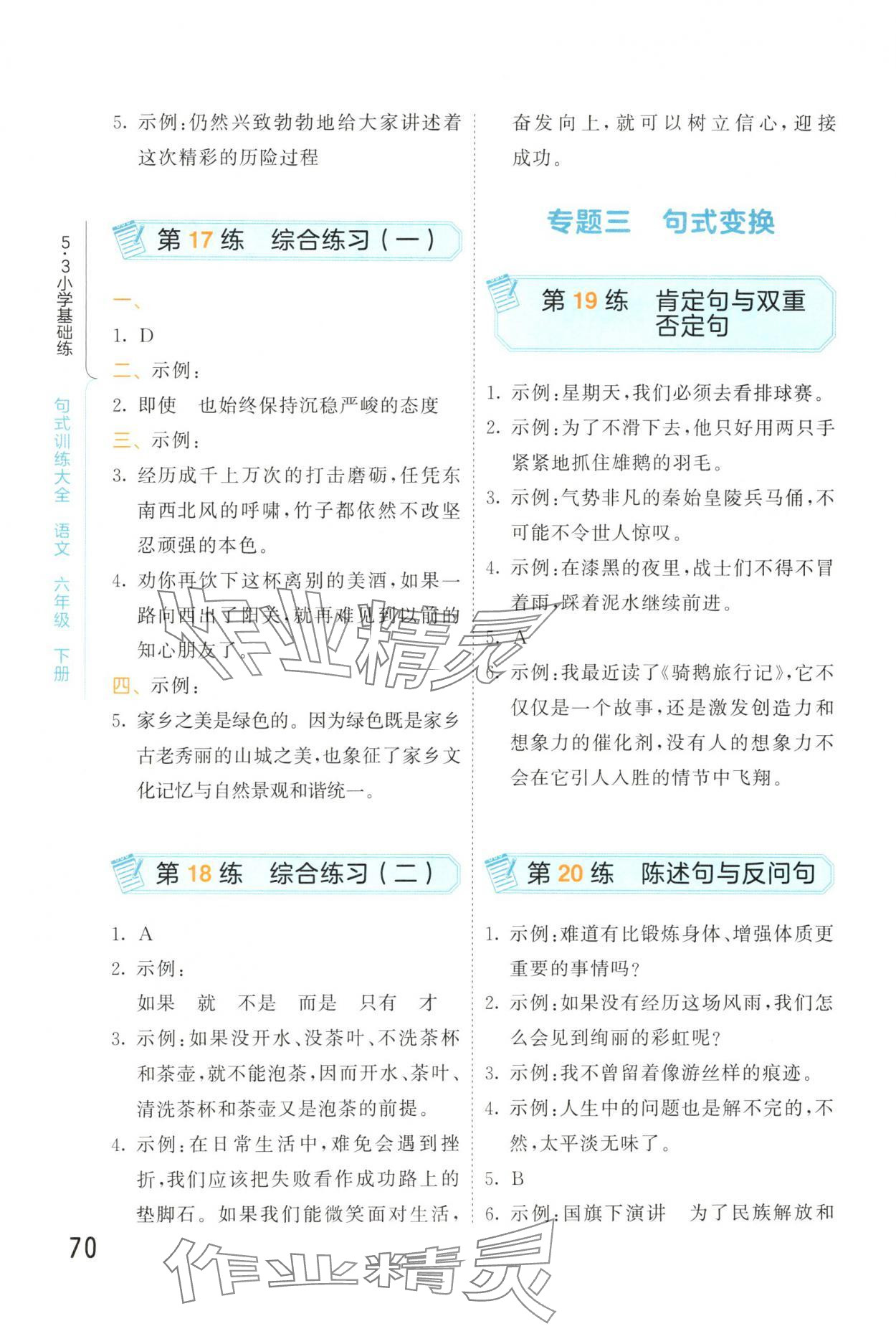 注:目前有些书本章节名称可能整理的还不是很完善,但都是按照顺序排列的,请同学们按照顺序仔细查找。练习册 2025年句式训练大全六年级语文下册人教版 答案主要是用来给同学们做完题方便对答案用的,请勿直接抄袭。