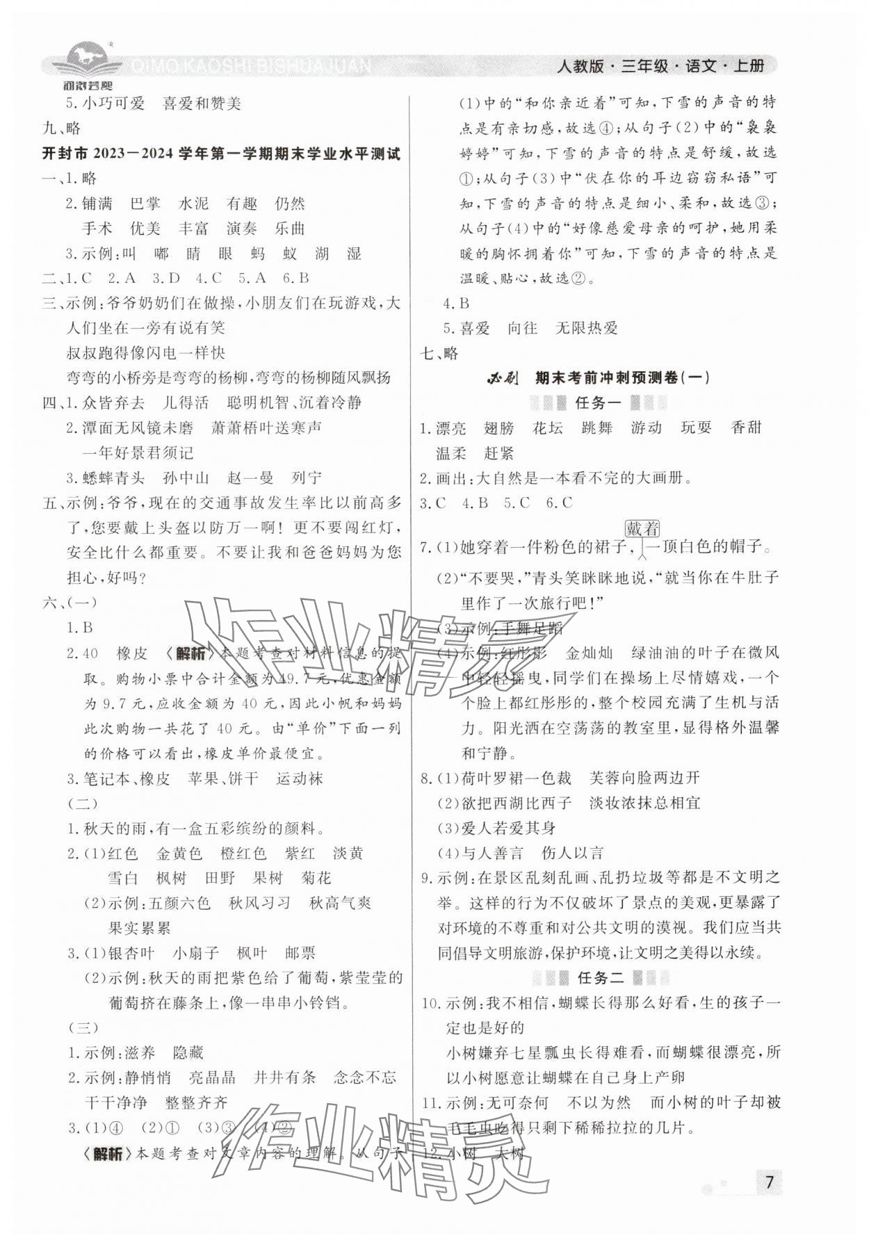 注:目前有些书本章节名称可能整理的还不是很完善,但都是按照顺序排列的,请同学们按照顺序仔细查找。练习册 2024年期末考试必刷卷三年级语文上册人教版河南专版 答案主要是用来给同学们做完题方便对答案用的,请勿直接抄袭。