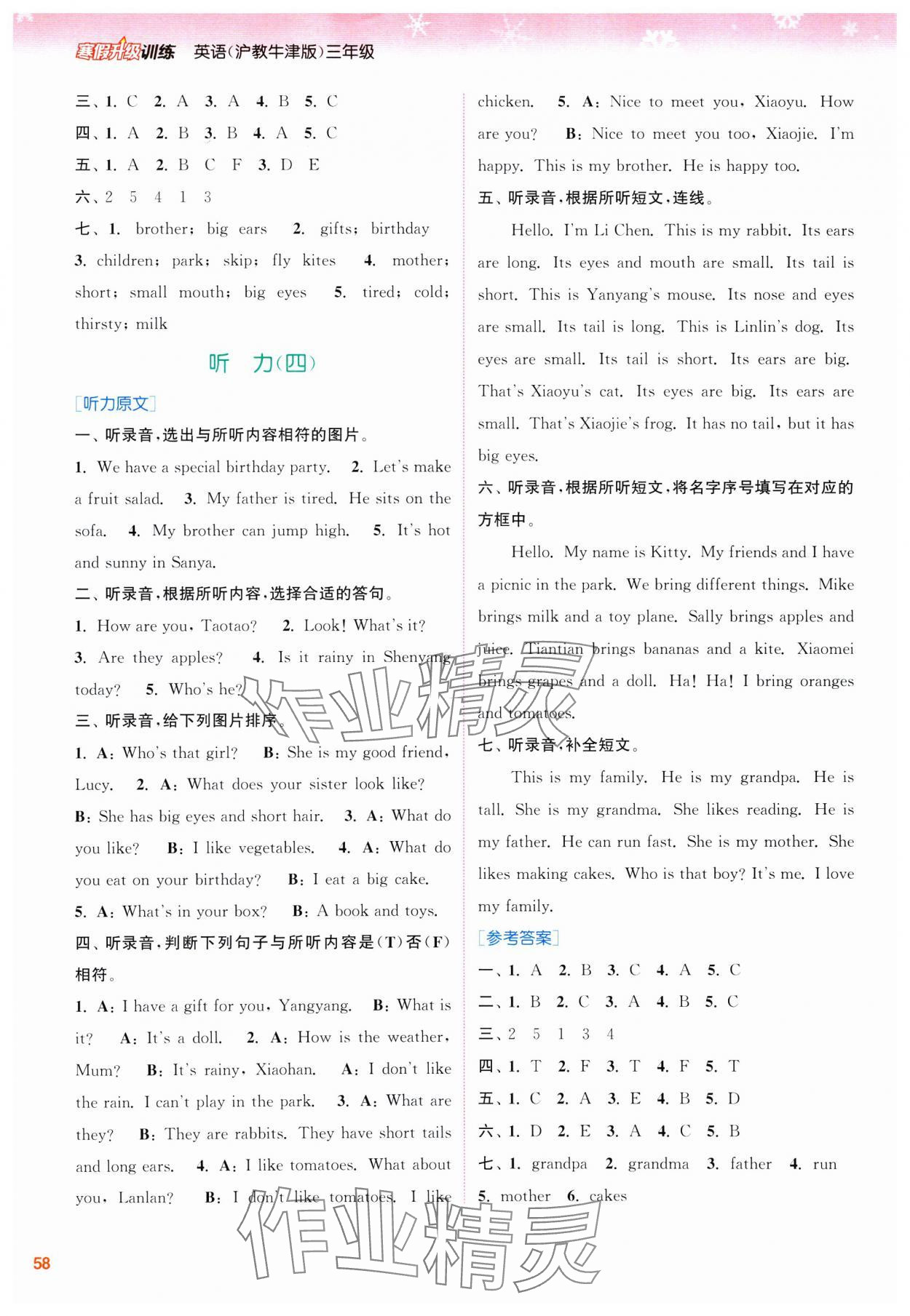 注:目前有些书本章节名称可能整理的还不是很完善,但都是按照顺序排列的,请同学们按照顺序仔细查找。练习册 2025年寒假升级训练浙江教育出版社三年级英语沪教牛津版 答案主要是用来给同学们做完题方便对答案用的,请勿直接抄袭。