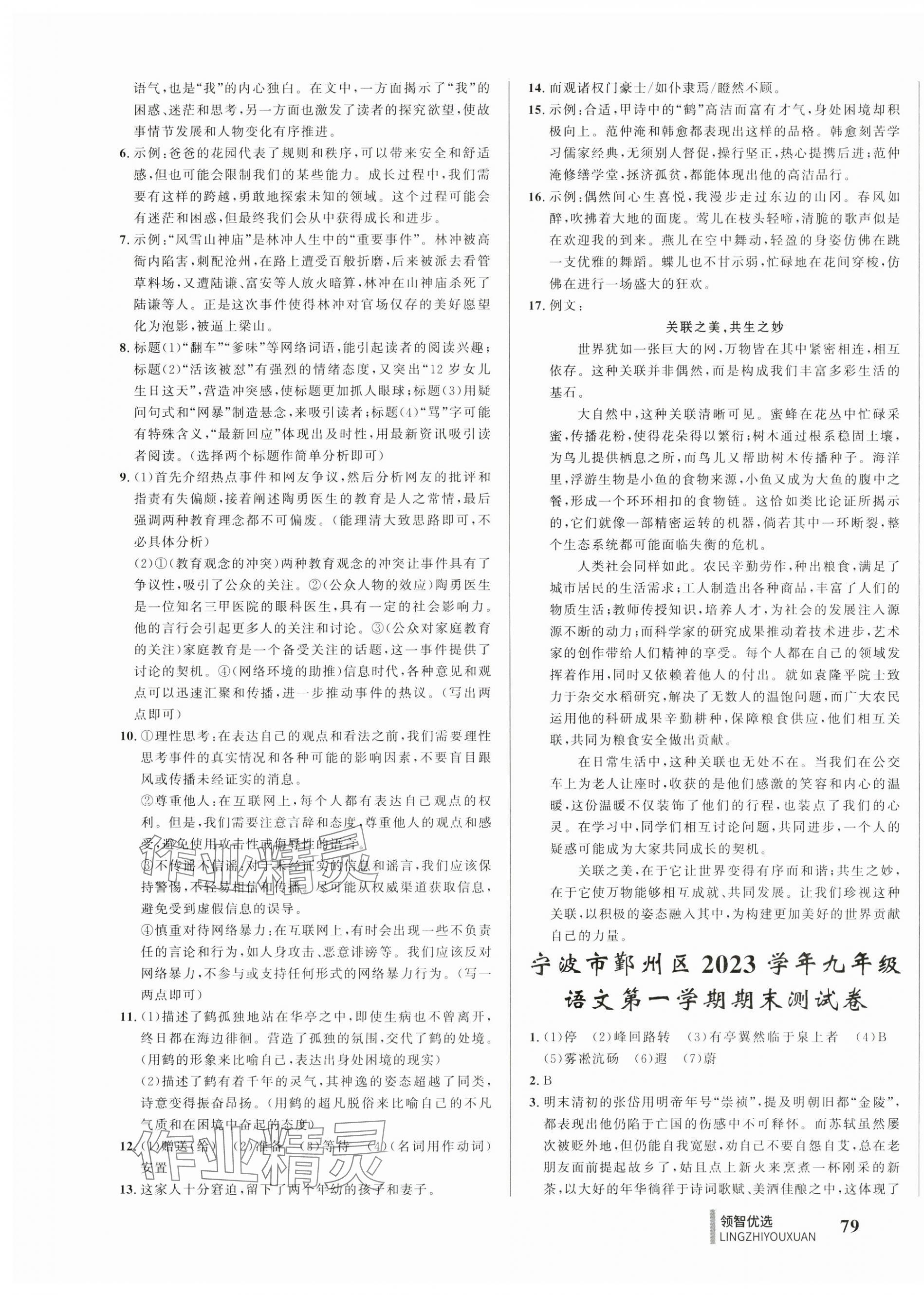 注:目前有些书本章节名称可能整理的还不是很完善,但都是按照顺序排列的,请同学们按照顺序仔细查找。练习册 2024年领智优选浙江期末复习卷九年级语文全一册人教版 答案主要是用来给同学们做完题方便对答案用的,请勿直接抄袭。