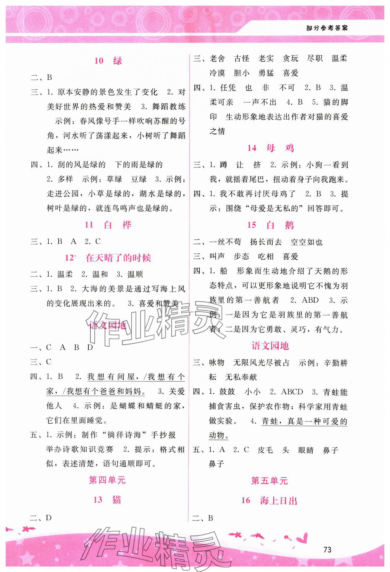 注:目前有些书本章节名称可能整理的还不是很完善,但都是按照顺序排列的,请同学们按照顺序仔细查找。练习册 2025年新课程学习辅导四年级语文下册人教版 答案主要是用来给同学们做完题方便对答案用的,请勿直接抄袭。