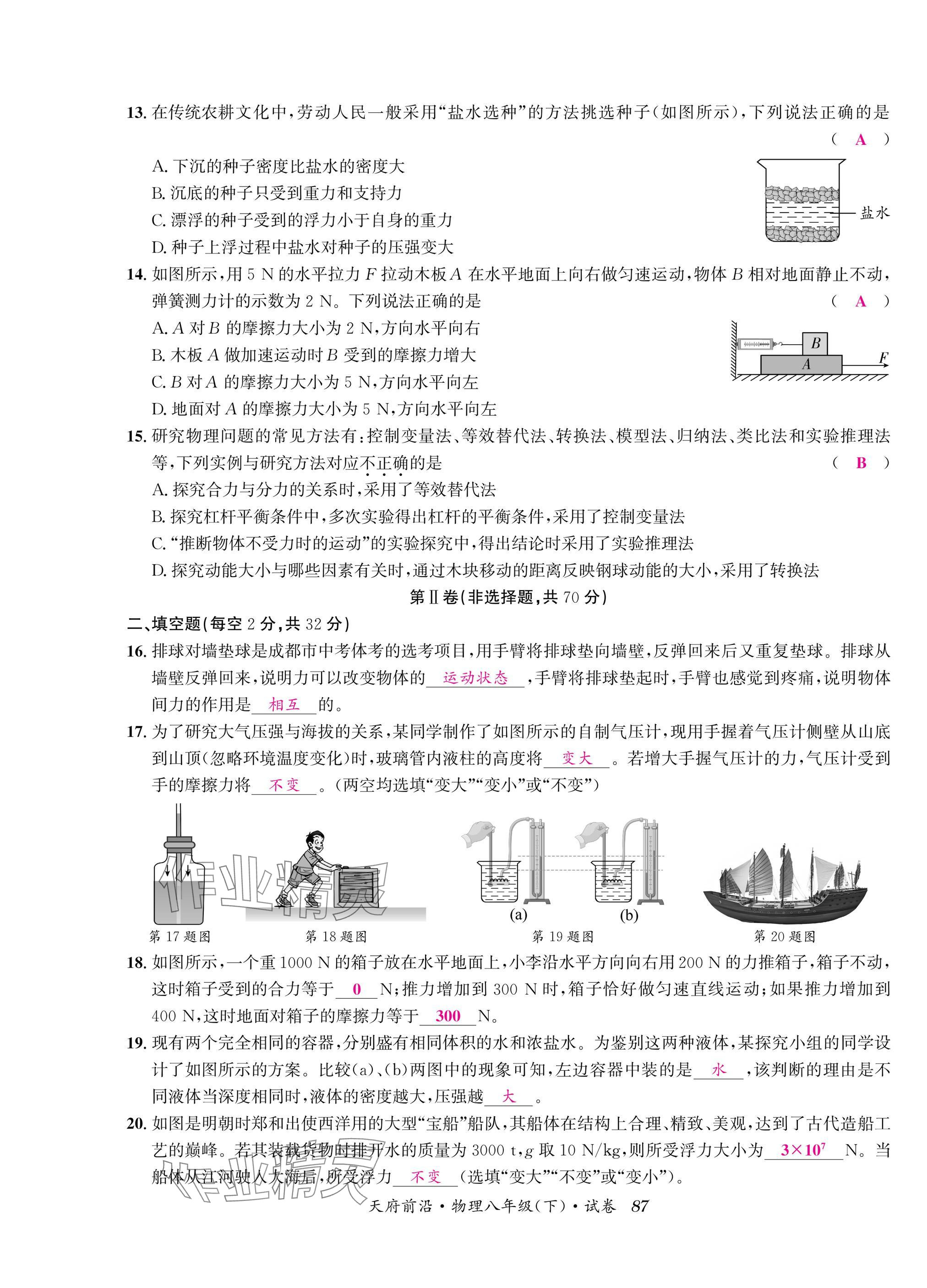 注:目前有些书本章节名称可能整理的还不是很完善,但都是按照顺序排列的,请同学们按照顺序仔细查找。练习册 2025年天府前沿八年级物理下册教科版 答案主要是用来给同学们做完题方便对答案用的,请勿直接抄袭。