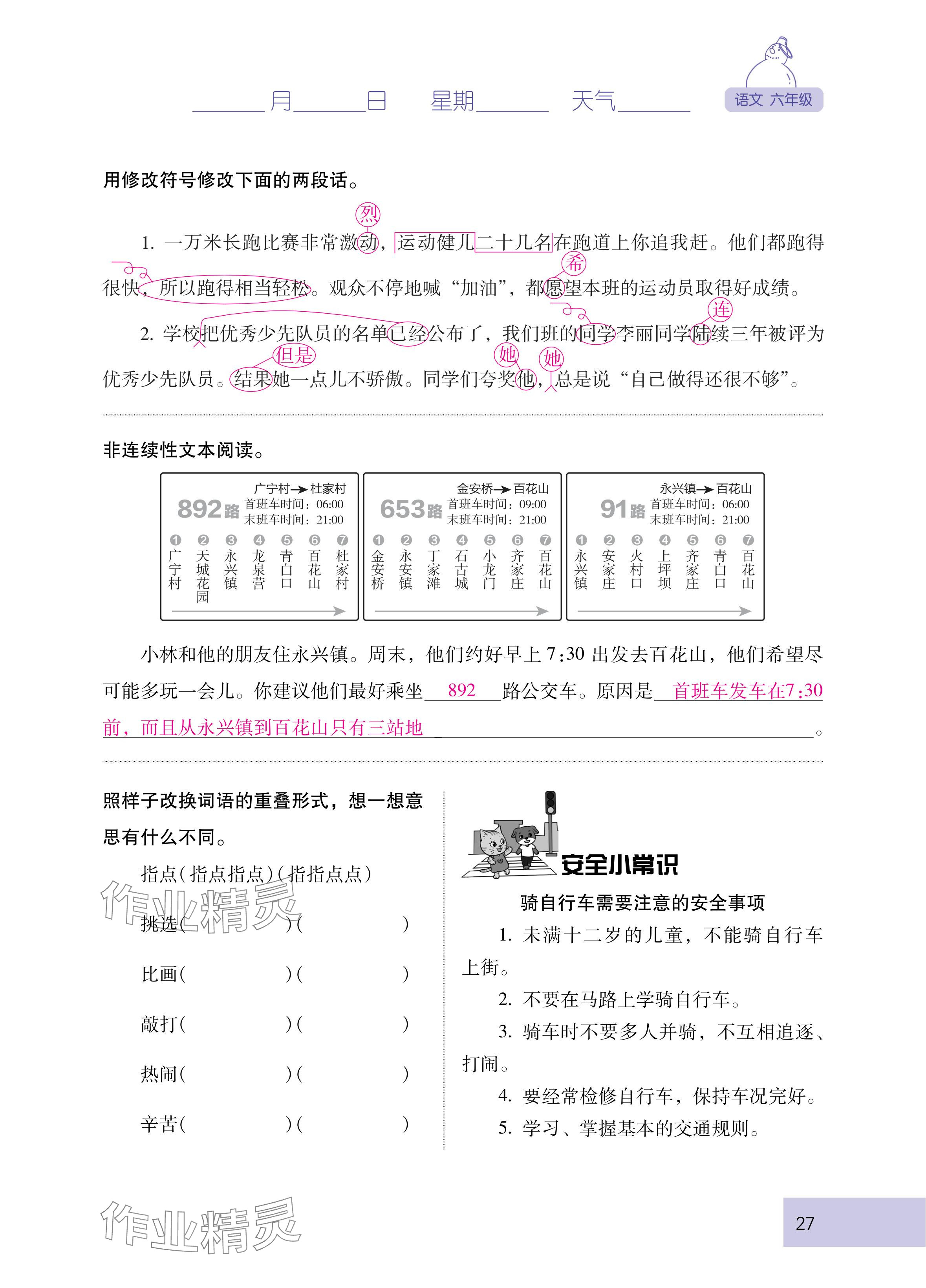 2025年云南省标准教辅寒假活动六年级语文人教版