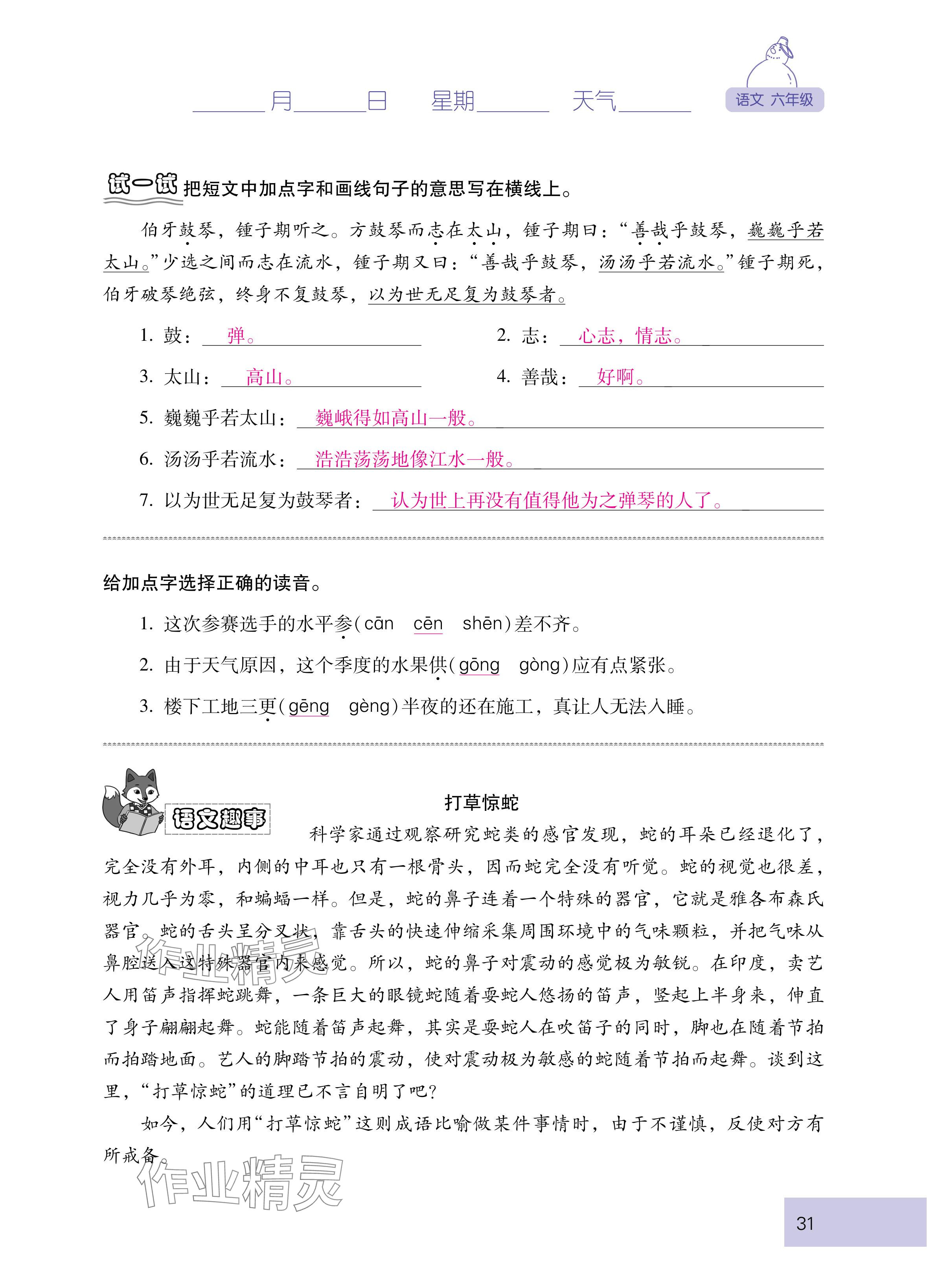 2025年云南省标准教辅寒假活动六年级语文人教版