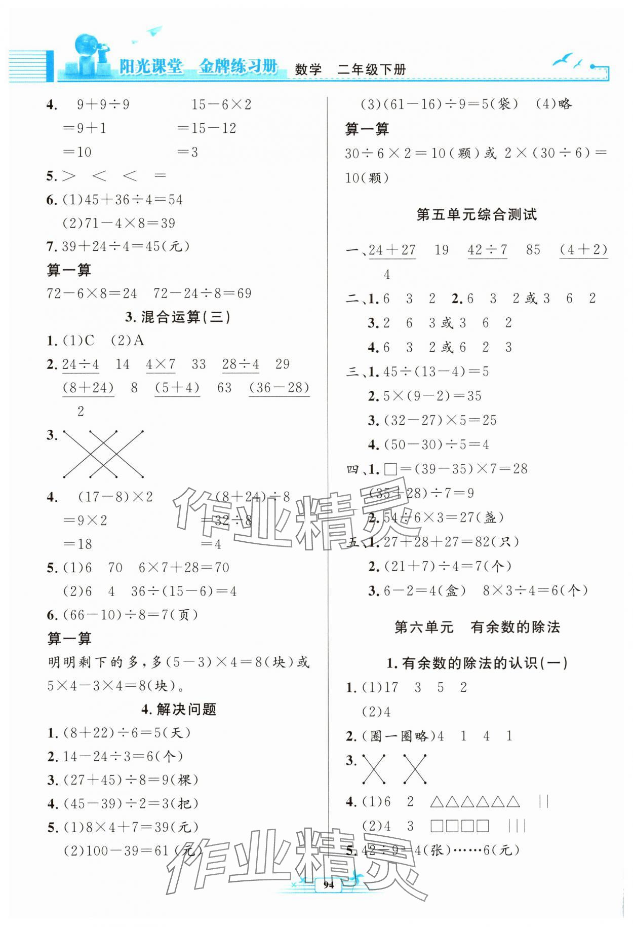 注:目前有些书本章节名称可能整理的还不是很完善,但都是按照顺序排列的,请同学们按照顺序仔细查找。练习册 2025年阳光课堂金牌练习册二年级数学下册人教版 答案主要是用来给同学们做完题方便对答案用的,请勿直接抄袭。