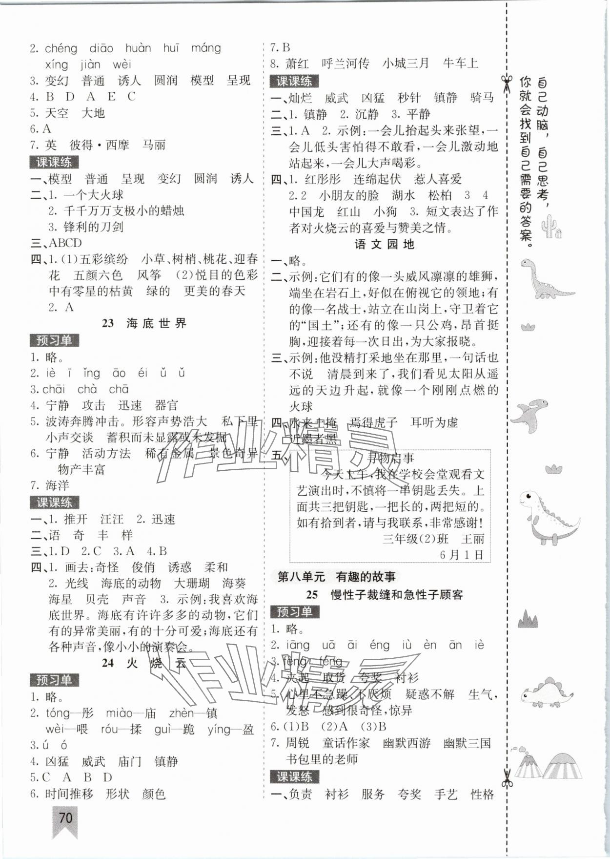 注:目前有些书本章节名称可能整理的还不是很完善,但都是按照顺序排列的,请同学们按照顺序仔细查找。练习册 2025年七彩课堂三年级语文下册人教版 答案主要是用来给同学们做完题方便对答案用的,请勿直接抄袭。