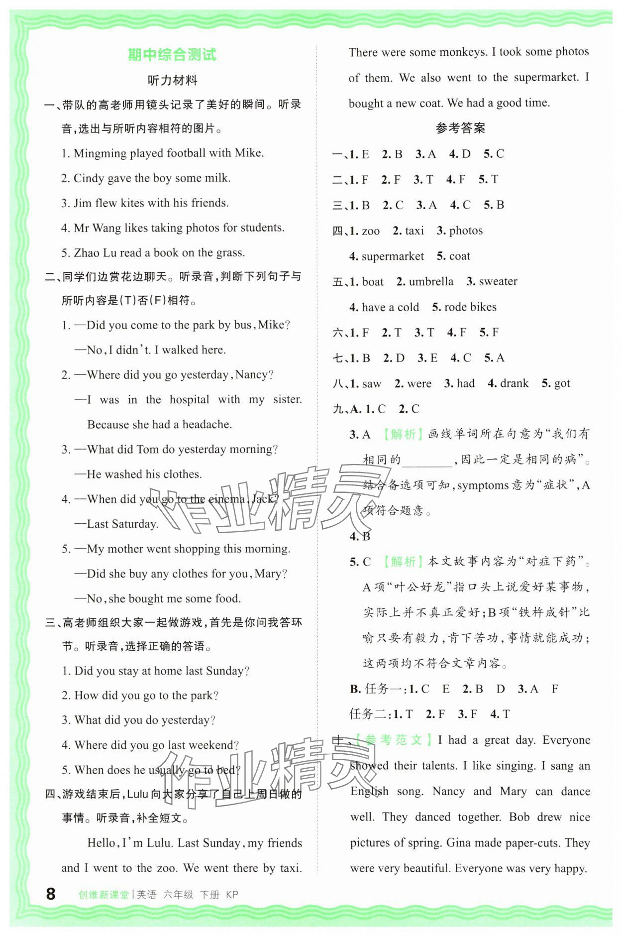 注:目前有些书本章节名称可能整理的还不是很完善,但都是按照顺序排列的,请同学们按照顺序仔细查找。练习册 2025年创维新课堂六年级英语下册科普版 答案主要是用来给同学们做完题方便对答案用的,请勿直接抄袭。