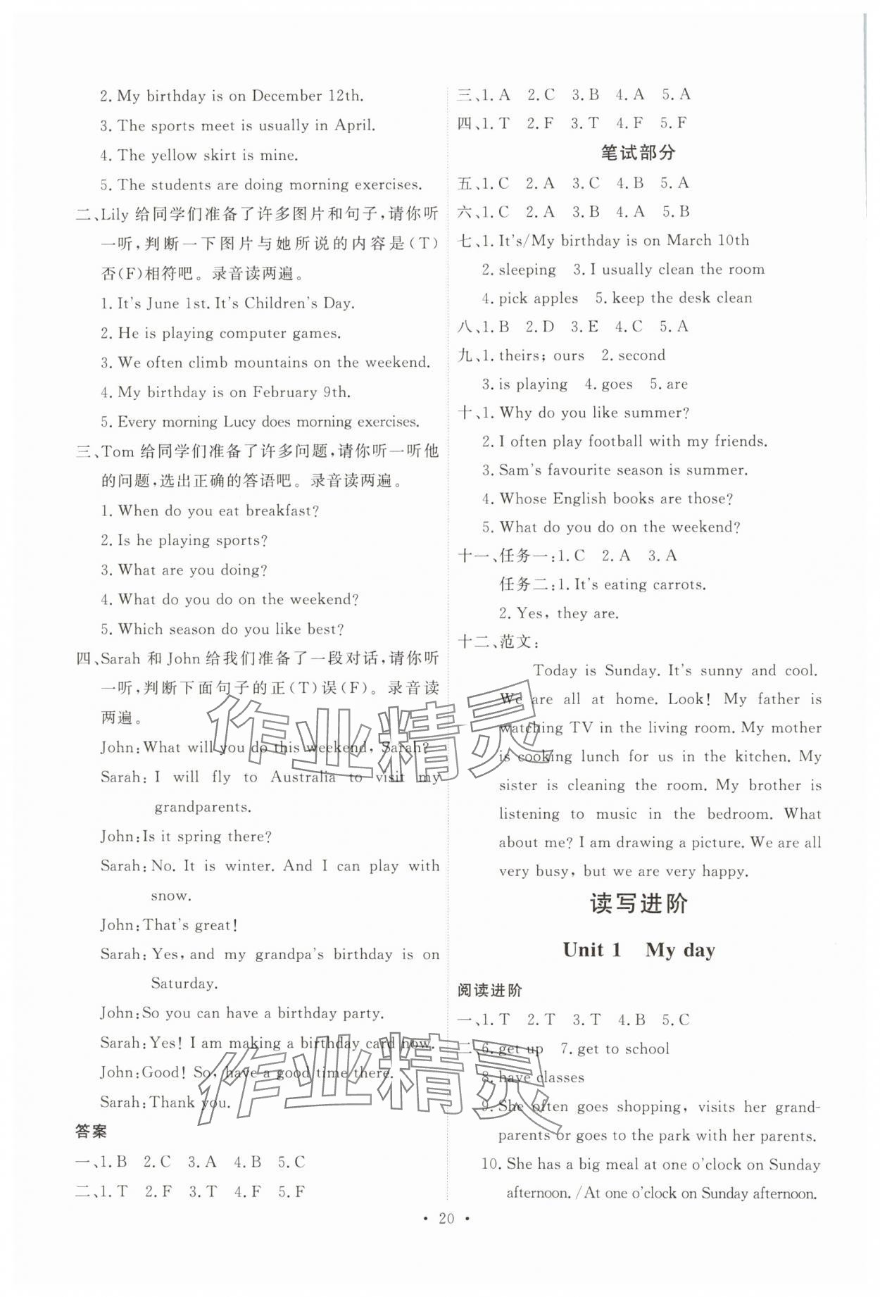 注:目前有些书本章节名称可能整理的还不是很完善,但都是按照顺序排列的,请同学们按照顺序仔细查找。练习册 2025年每时每刻快乐优加作业本五年级英语下册人教版 答案主要是用来给同学们做完题方便对答案用的,请勿直接抄袭。