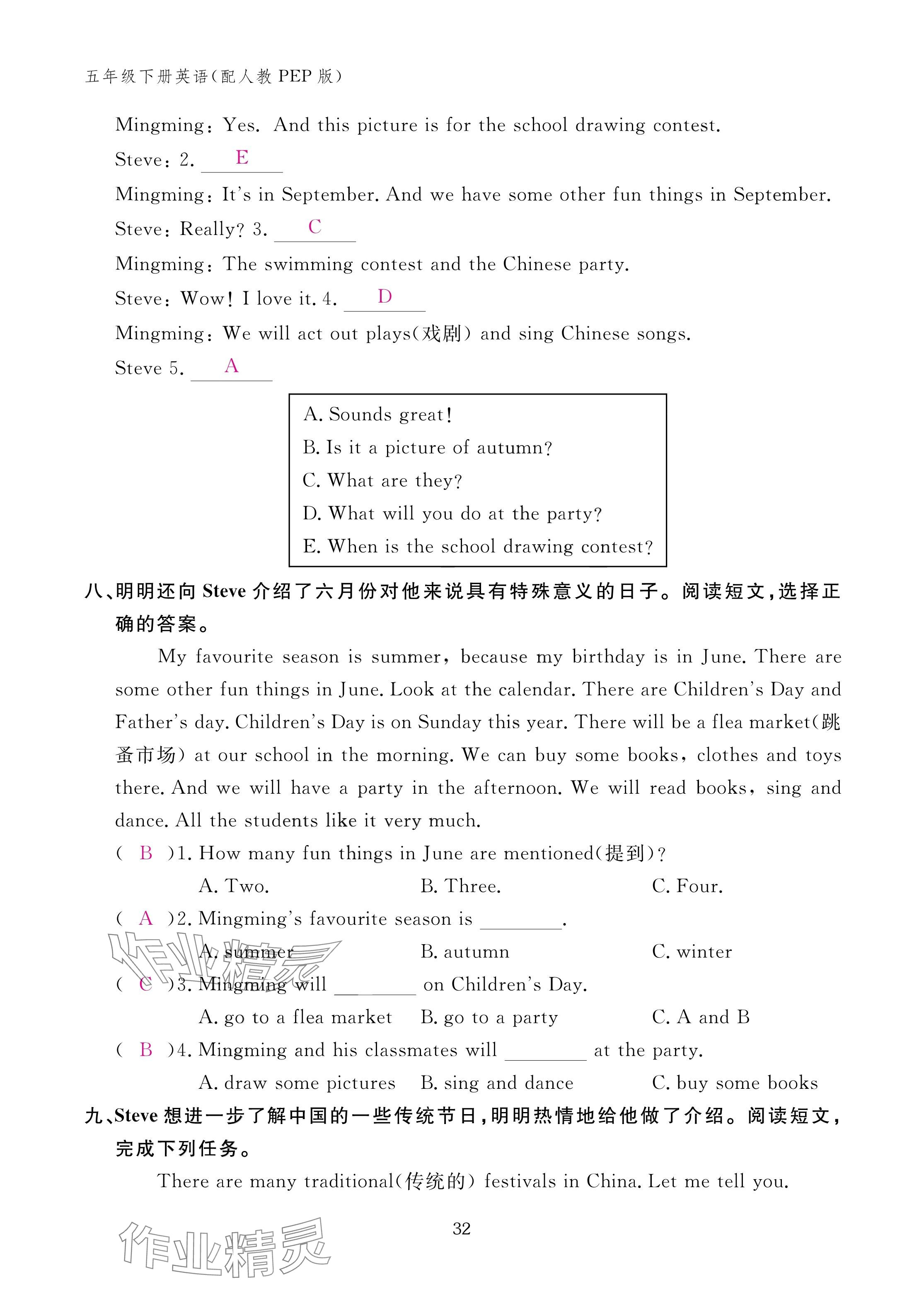 注:目前有些书本章节名称可能整理的还不是很完善,但都是按照顺序排列的,请同学们按照顺序仔细查找。练习册 2025年作业本江西教育出版社五年级英语下册人教版 答案主要是用来给同学们做完题方便对答案用的,请勿直接抄袭。