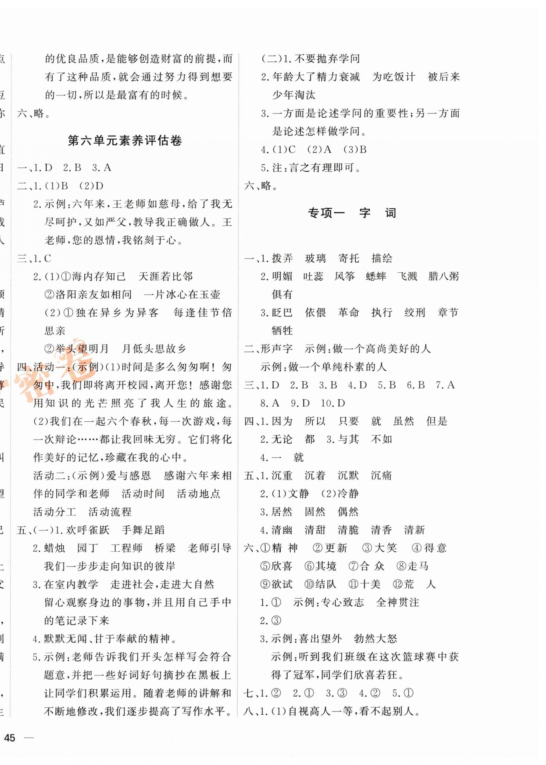 注:目前有些书本章节名称可能整理的还不是很完善,但都是按照顺序排列的,请同学们按照顺序仔细查找。练习册 2025年优加密卷六年级语文下册人教版 答案主要是用来给同学们做完题方便对答案用的,请勿直接抄袭。