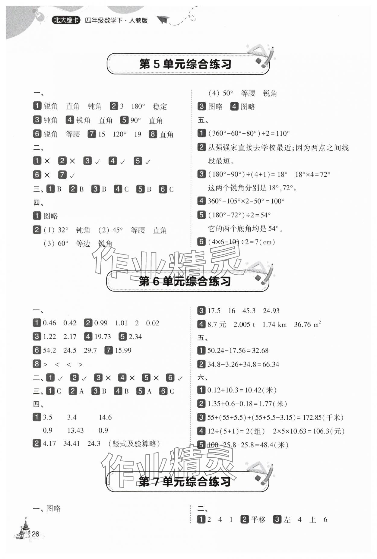 注:目前有些书本章节名称可能整理的还不是很完善,但都是按照顺序排列的,请同学们按照顺序仔细查找。练习册 2025年北大绿卡四年级数学下册人教版 答案主要是用来给同学们做完题方便对答案用的,请勿直接抄袭。