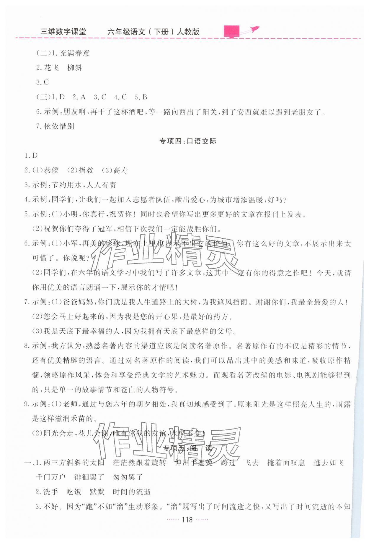 注:目前有些书本章节名称可能整理的还不是很完善,但都是按照顺序排列的,请同学们按照顺序仔细查找。练习册 2025年三维数字课堂六年级语文下册人教版 答案主要是用来给同学们做完题方便对答案用的,请勿直接抄袭。