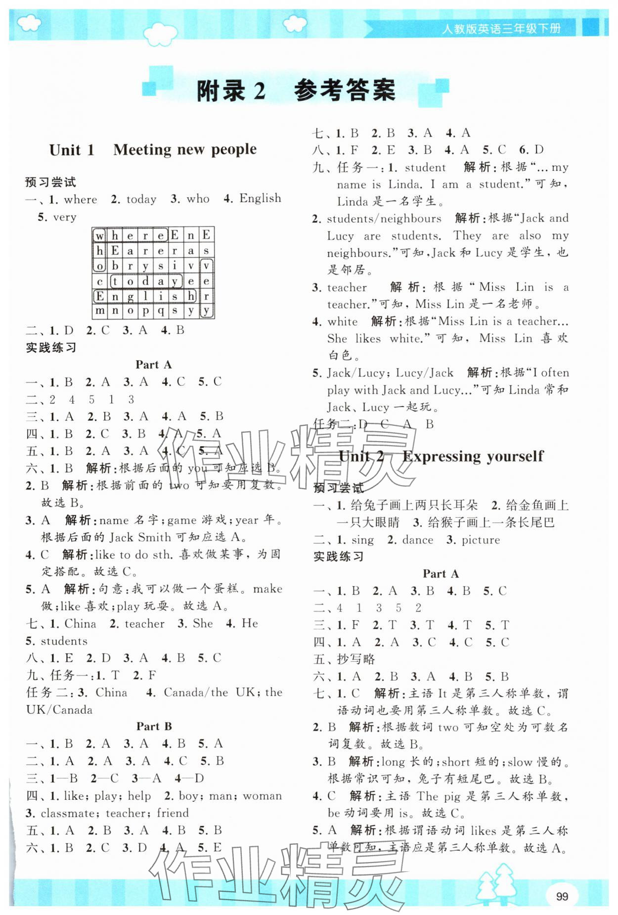 注:目前有些书本章节名称可能整理的还不是很完善,但都是按照顺序排列的,请同学们按照顺序仔细查找。练习册 2025年同步实践评价课程基础训练湖南少年儿童出版社三年级英语下册人教版 答案主要是用来给同学们做完题方便对答案用的,请勿直接抄袭。