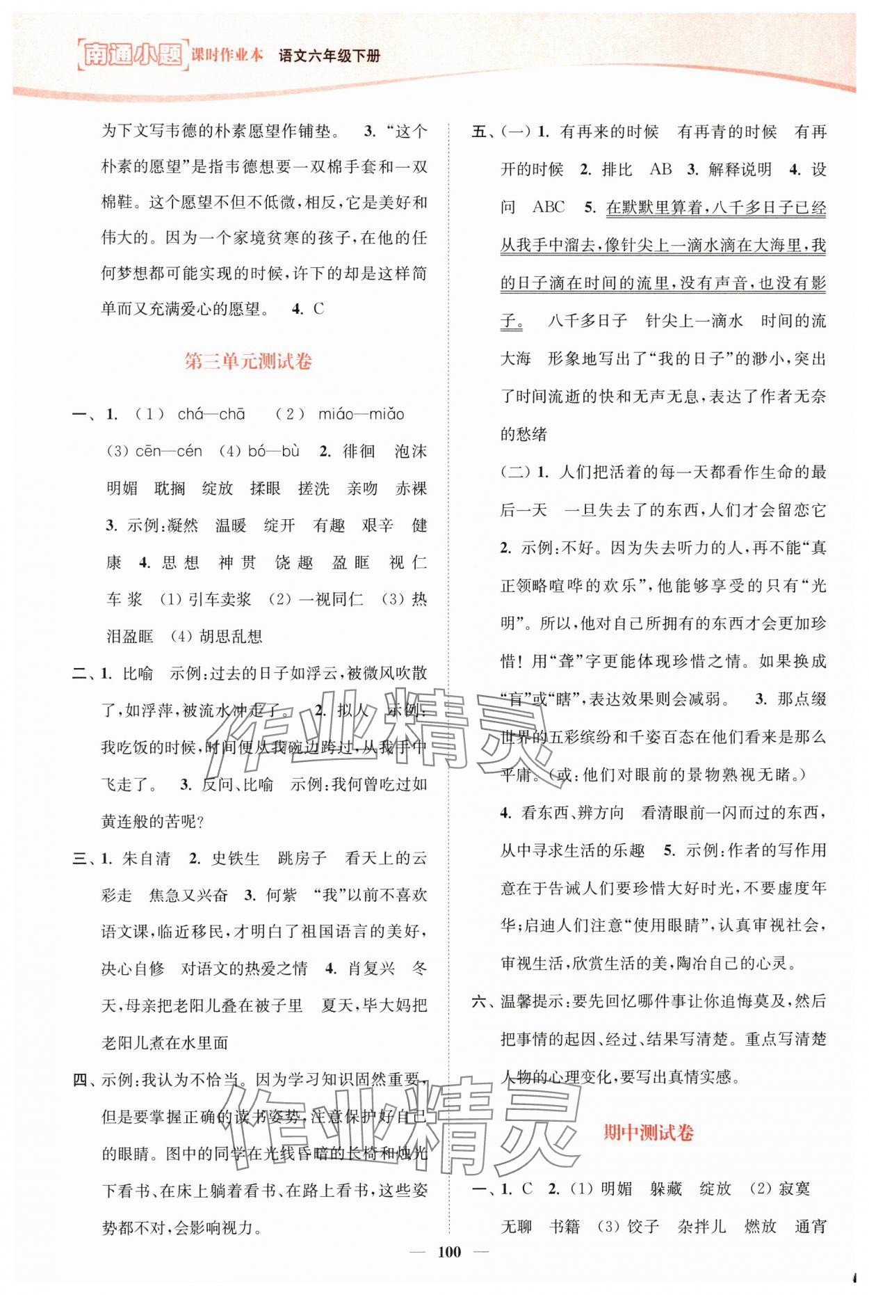 注:目前有些书本章节名称可能整理的还不是很完善,但都是按照顺序排列的,请同学们按照顺序仔细查找。练习册 2025年南通小题课时作业本六年级语文下册人教版 答案主要是用来给同学们做完题方便对答案用的,请勿直接抄袭。