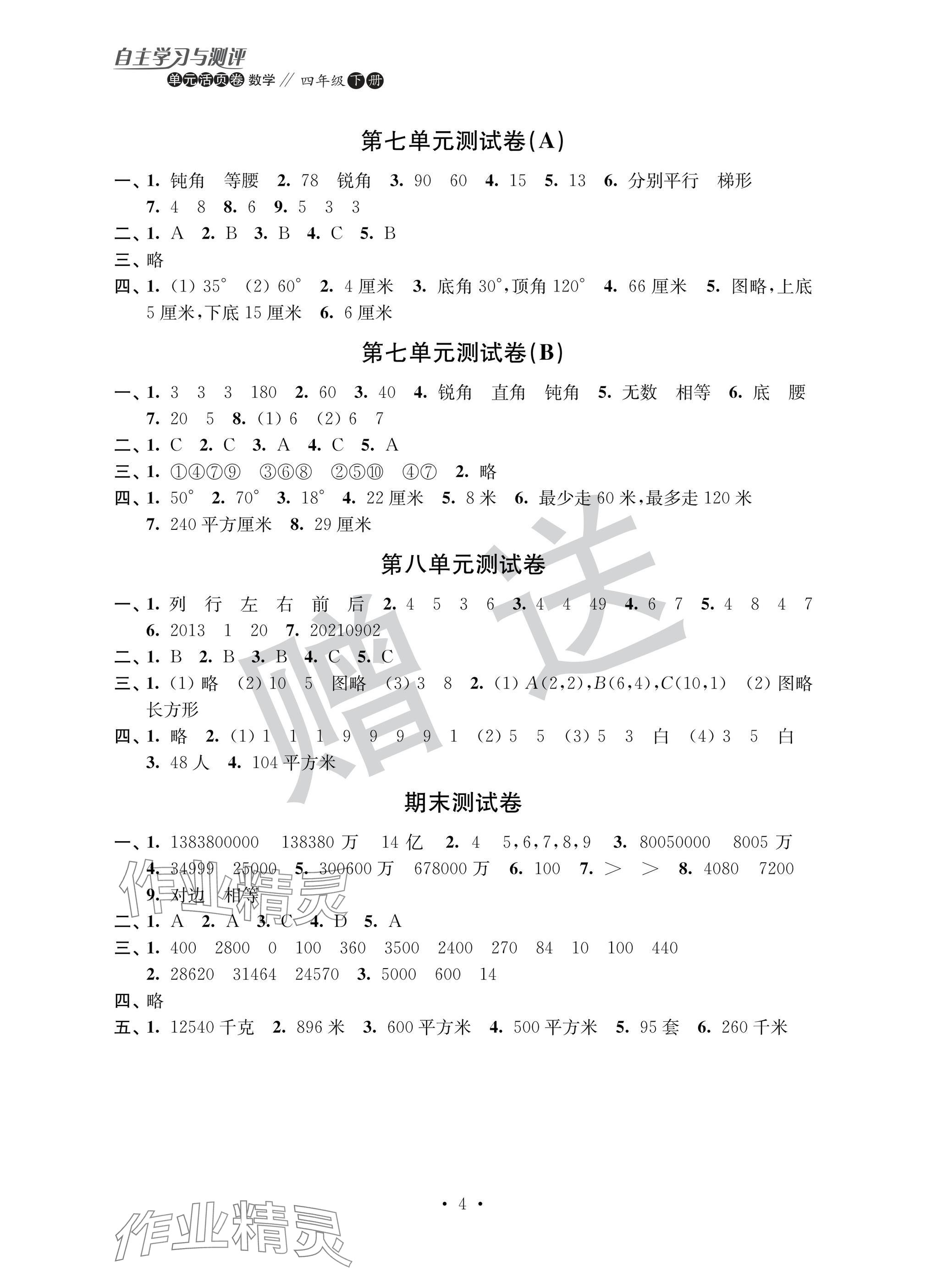 注:目前有些书本章节名称可能整理的还不是很完善,但都是按照顺序排列的,请同学们按照顺序仔细查找。练习册 2025年自主学习与测评单元活页卷四年级数学下册苏教版 答案主要是用来给同学们做完题方便对答案用的,请勿直接抄袭。