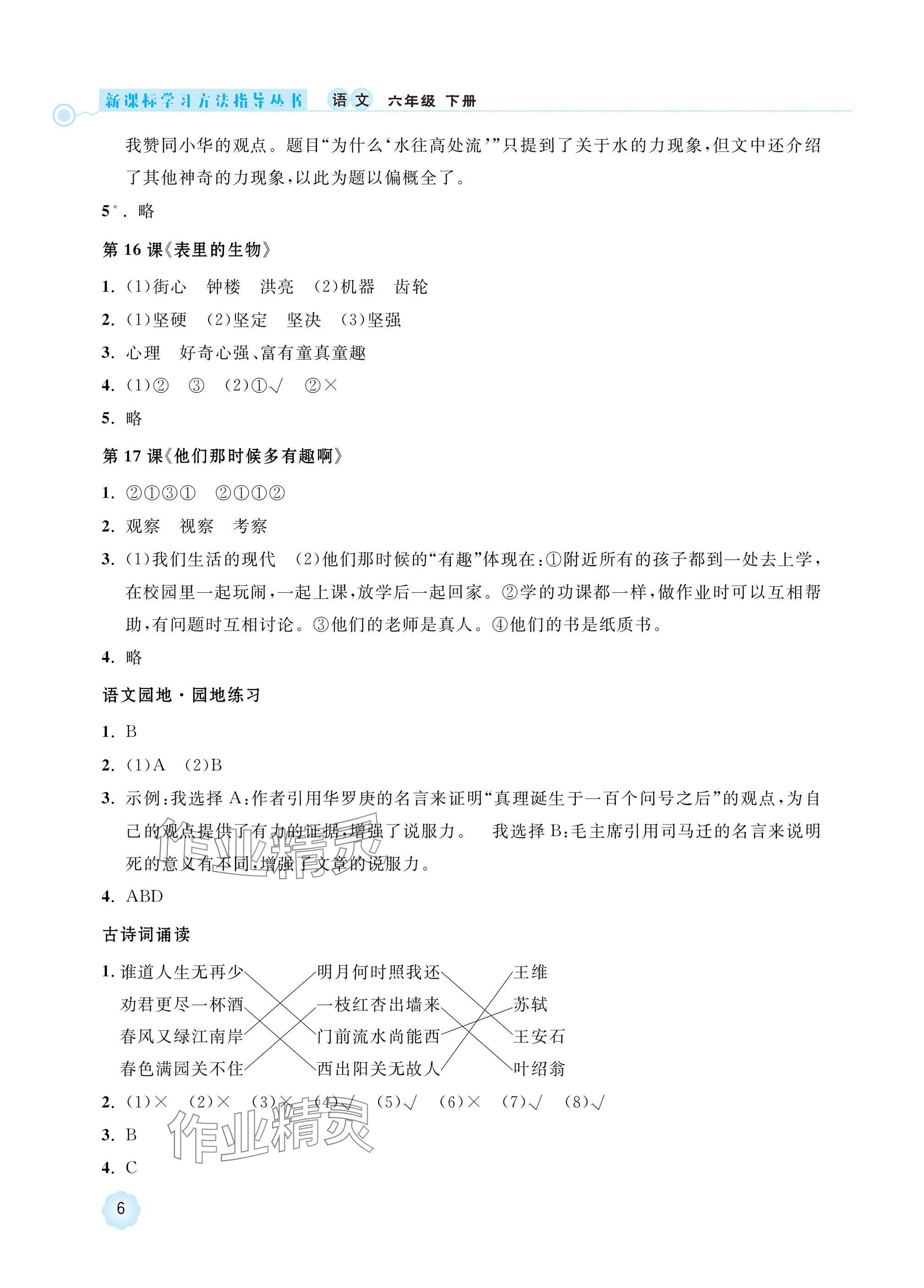 注:目前有些书本章节名称可能整理的还不是很完善,但都是按照顺序排列的,请同学们按照顺序仔细查找。练习册 2025年新课标学习方法指导丛书六年级语文下册人教版 答案主要是用来给同学们做完题方便对答案用的,请勿直接抄袭。