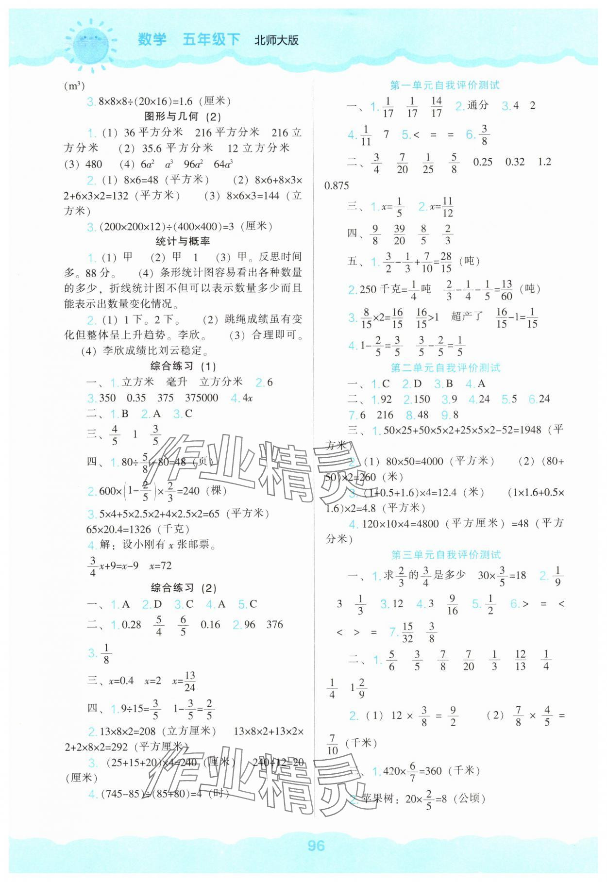 注:目前有些书本章节名称可能整理的还不是很完善,但都是按照顺序排列的,请同学们按照顺序仔细查找。练习册 2025年新课程能力培养五年级数学下册北师大版 答案主要是用来给同学们做完题方便对答案用的,请勿直接抄袭。