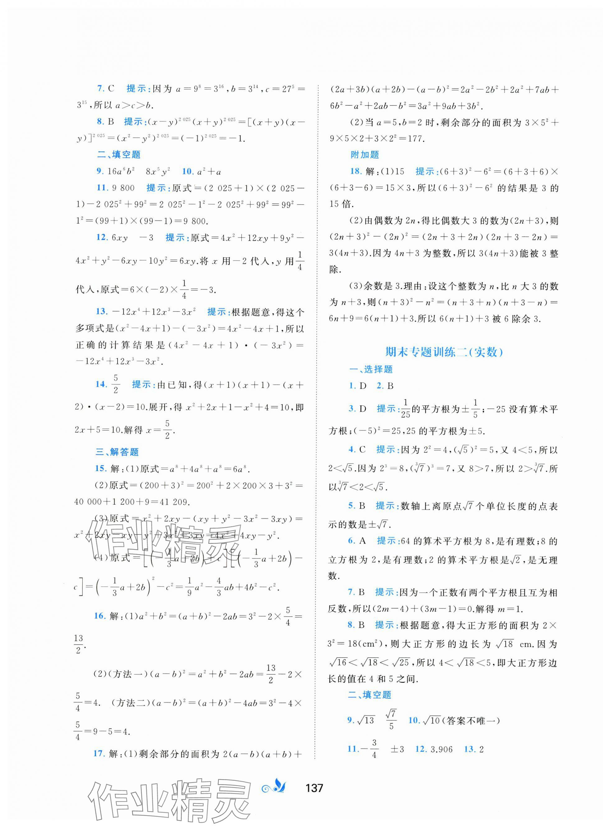 注:目前有些书本章节名称可能整理的还不是很完善,但都是按照顺序排列的,请同学们按照顺序仔细查找。练习册 2025年新课程学习与测评单元双测七年级数学下册湘教版 答案主要是用来给同学们做完题方便对答案用的,请勿直接抄袭。