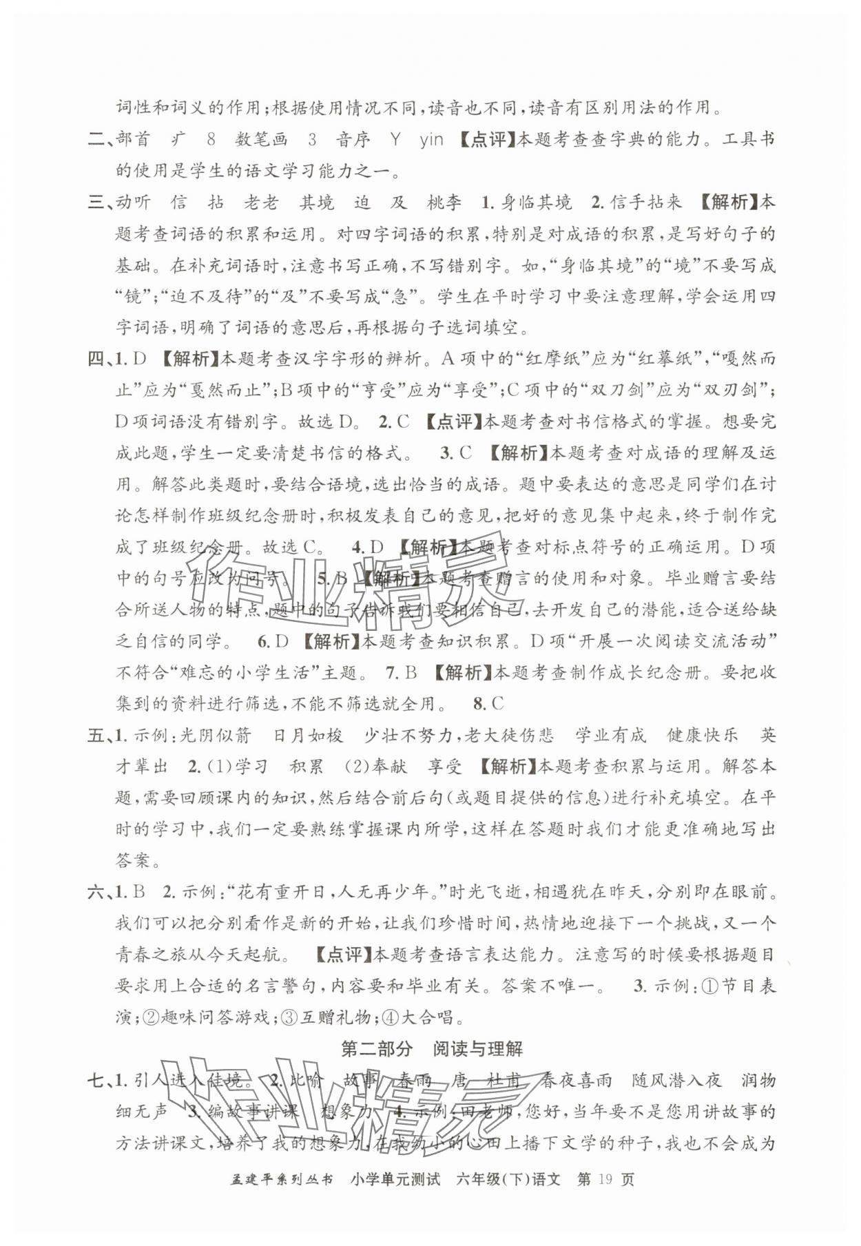 注:目前有些书本章节名称可能整理的还不是很完善,但都是按照顺序排列的,请同学们按照顺序仔细查找。练习册 2025年孟建平单元测试六年级语文下册人教版 答案主要是用来给同学们做完题方便对答案用的,请勿直接抄袭。