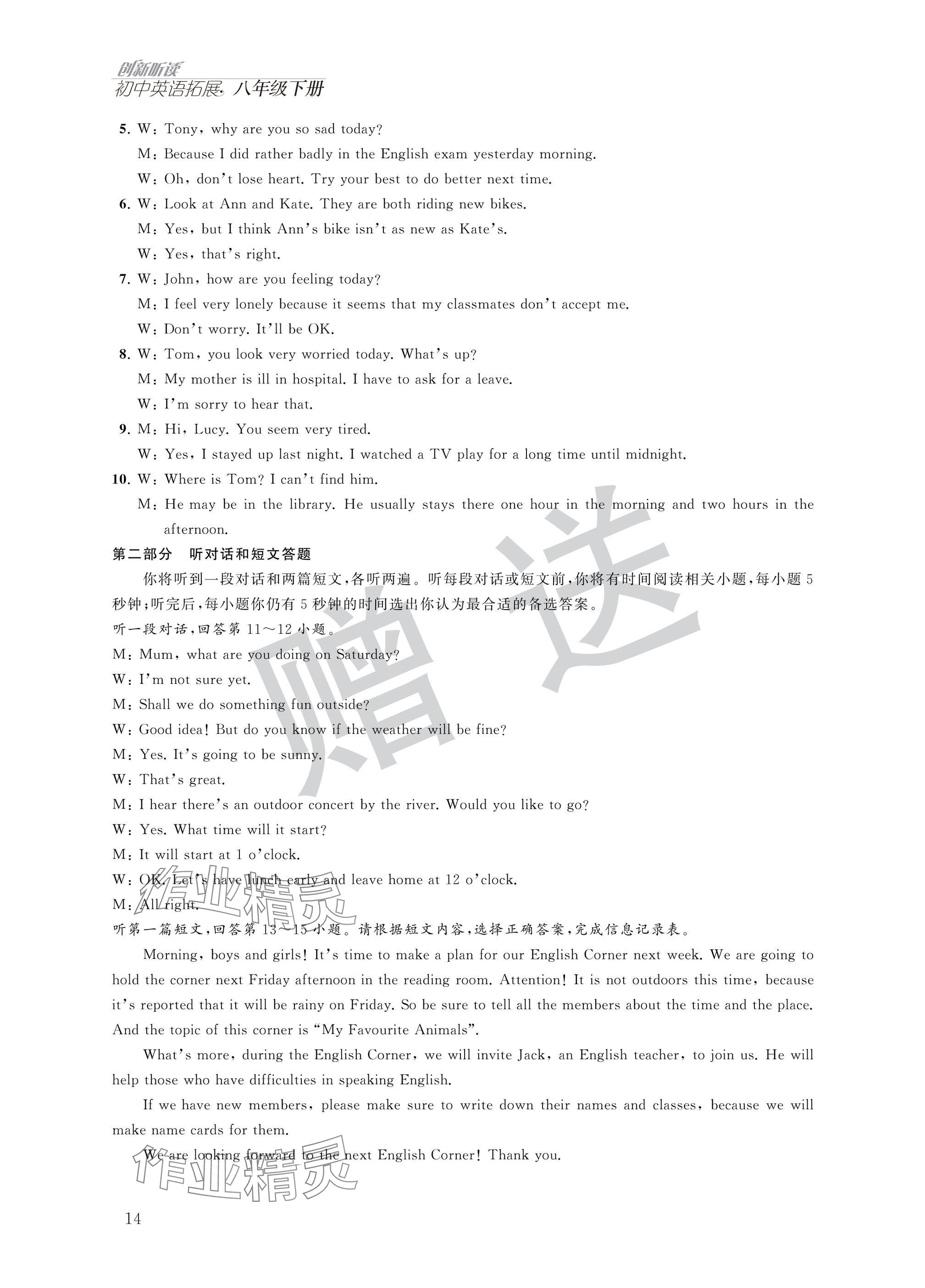 注:目前有些书本章节名称可能整理的还不是很完善,但都是按照顺序排列的,请同学们按照顺序仔细查找。练习册 2025年英语拓展听力与阅读八年级下册译林版 答案主要是用来给同学们做完题方便对答案用的,请勿直接抄袭。