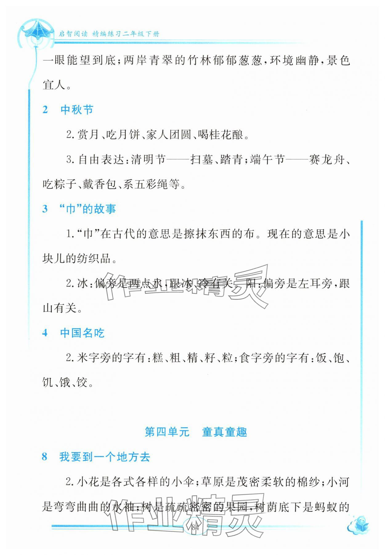 注:目前有些书本章节名称可能整理的还不是很完善,但都是按照顺序排列的,请同学们按照顺序仔细查找。练习册 2025年启智阅读精编练习二年级下册人教版 答案主要是用来给同学们做完题方便对答案用的,请勿直接抄袭。