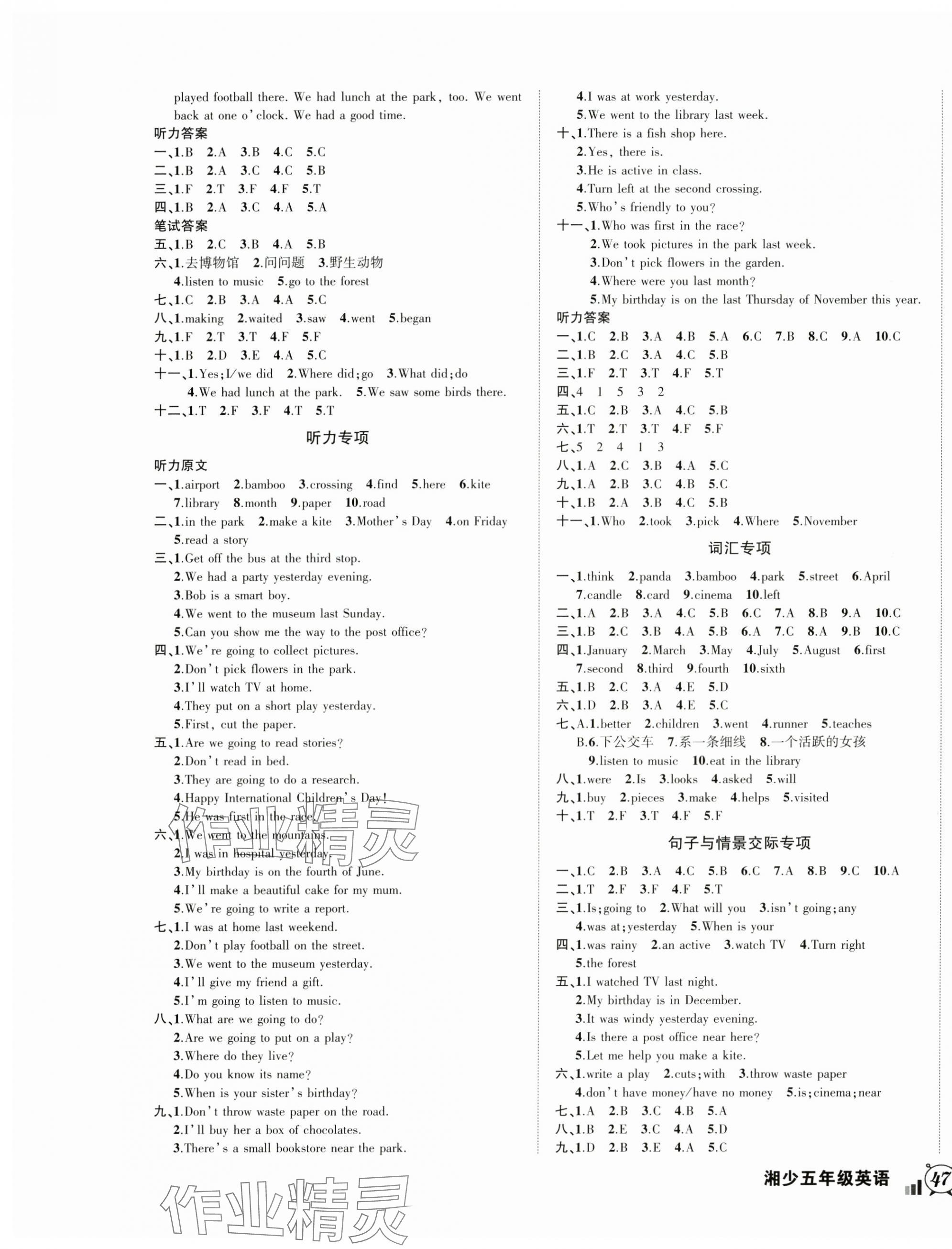 注:目前有些书本章节名称可能整理的还不是很完善,但都是按照顺序排列的,请同学们按照顺序仔细查找。练习册 2025年状元成才路创新名卷五年级英语下册湘少版 答案主要是用来给同学们做完题方便对答案用的,请勿直接抄袭。