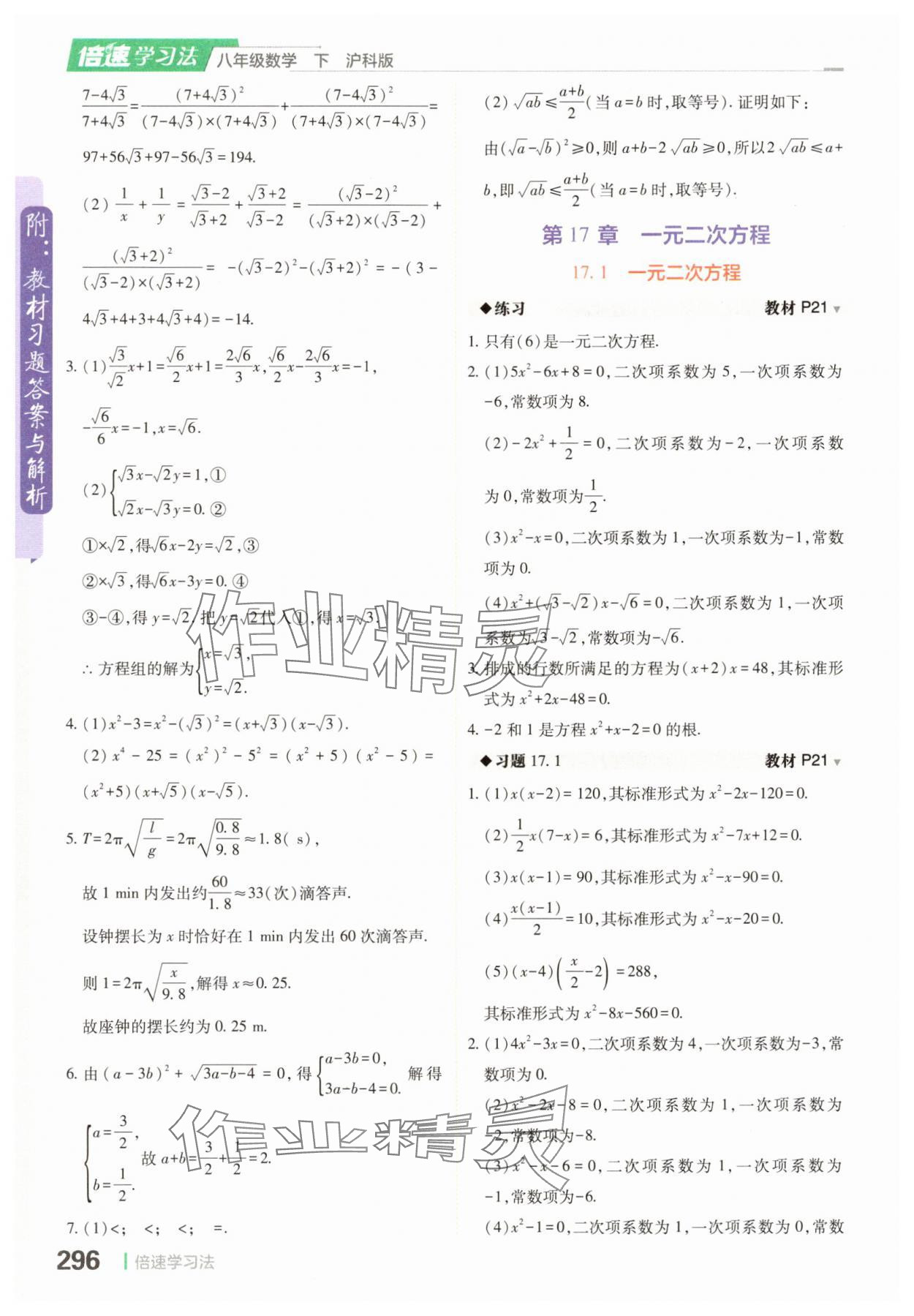 注:目前有些书本章节名称可能整理的还不是很完善,但都是按照顺序排列的,请同学们按照顺序仔细查找。练习册 2025年倍速学习法八年级数学沪科版下册 答案主要是用来给同学们做完题方便对答案用的,请勿直接抄袭。