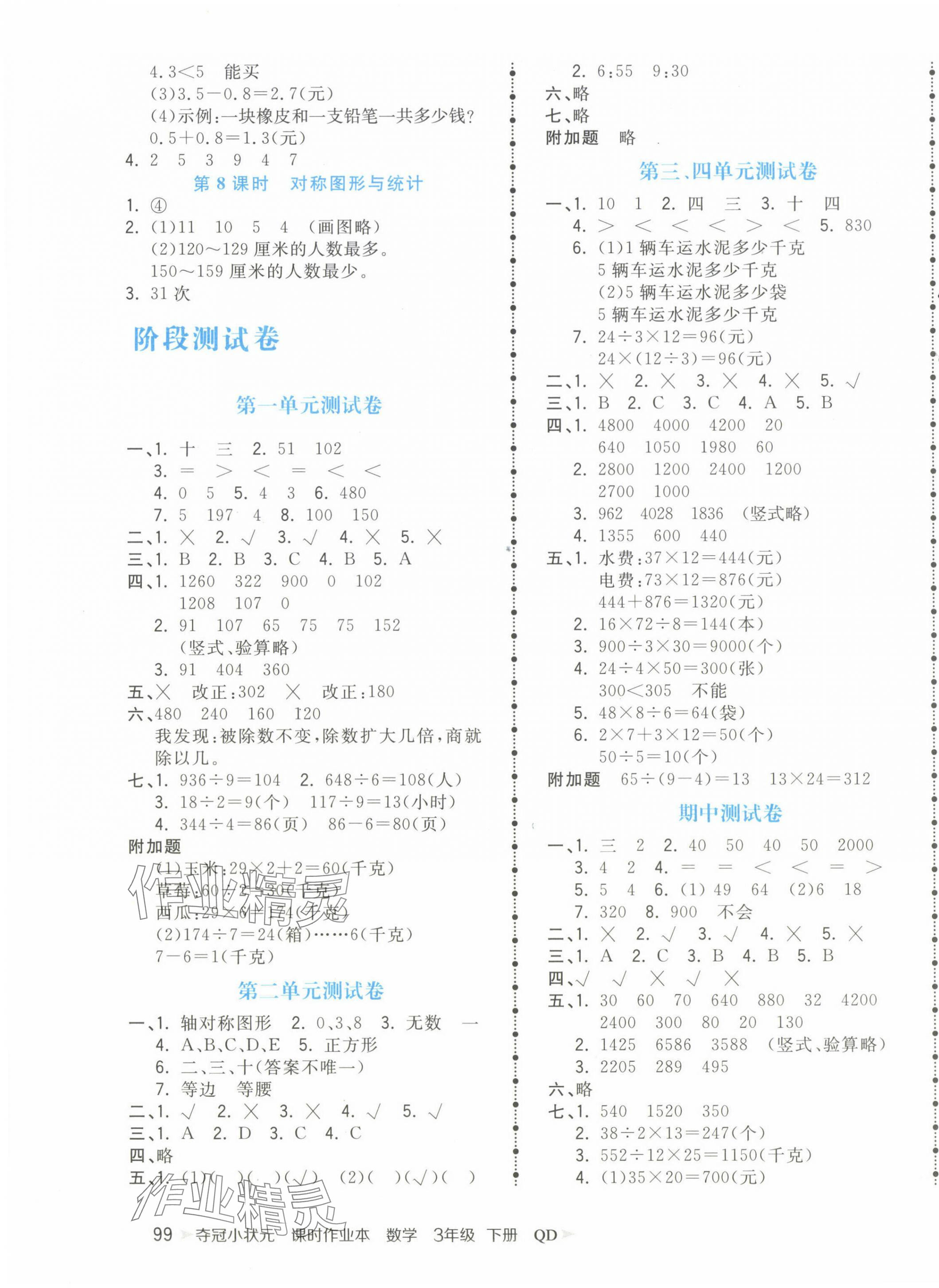 注:目前有些书本章节名称可能整理的还不是很完善,但都是按照顺序排列的,请同学们按照顺序仔细查找。练习册 2025年夺冠小状元课时作业本三年级数学下册青岛版 答案主要是用来给同学们做完题方便对答案用的,请勿直接抄袭。