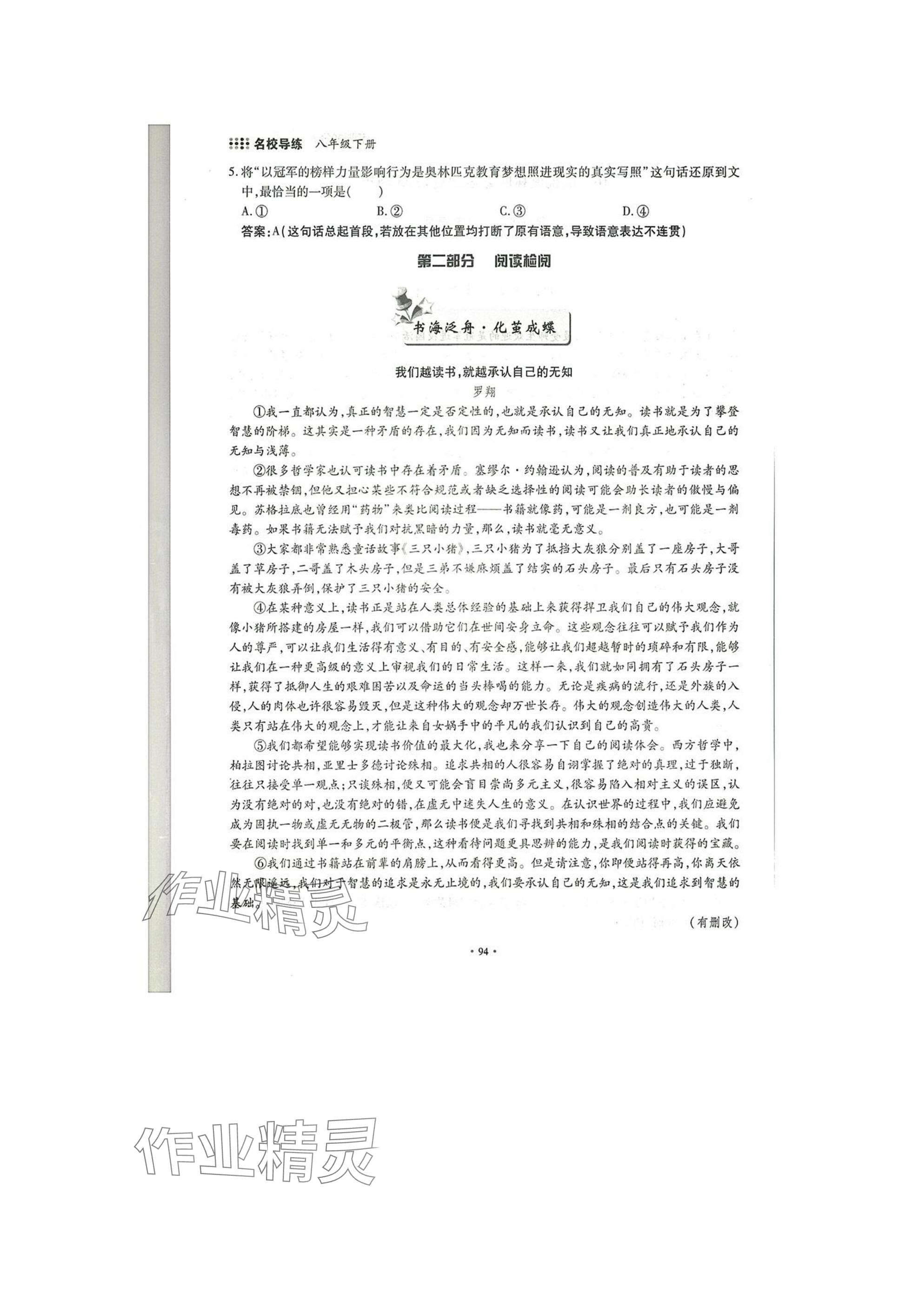 注:目前有些书本章节名称可能整理的还不是很完善,但都是按照顺序排列的,请同学们按照顺序仔细查找。练习册 2025年名校导练八年级语文下册人教版 答案主要是用来给同学们做完题方便对答案用的,请勿直接抄袭。