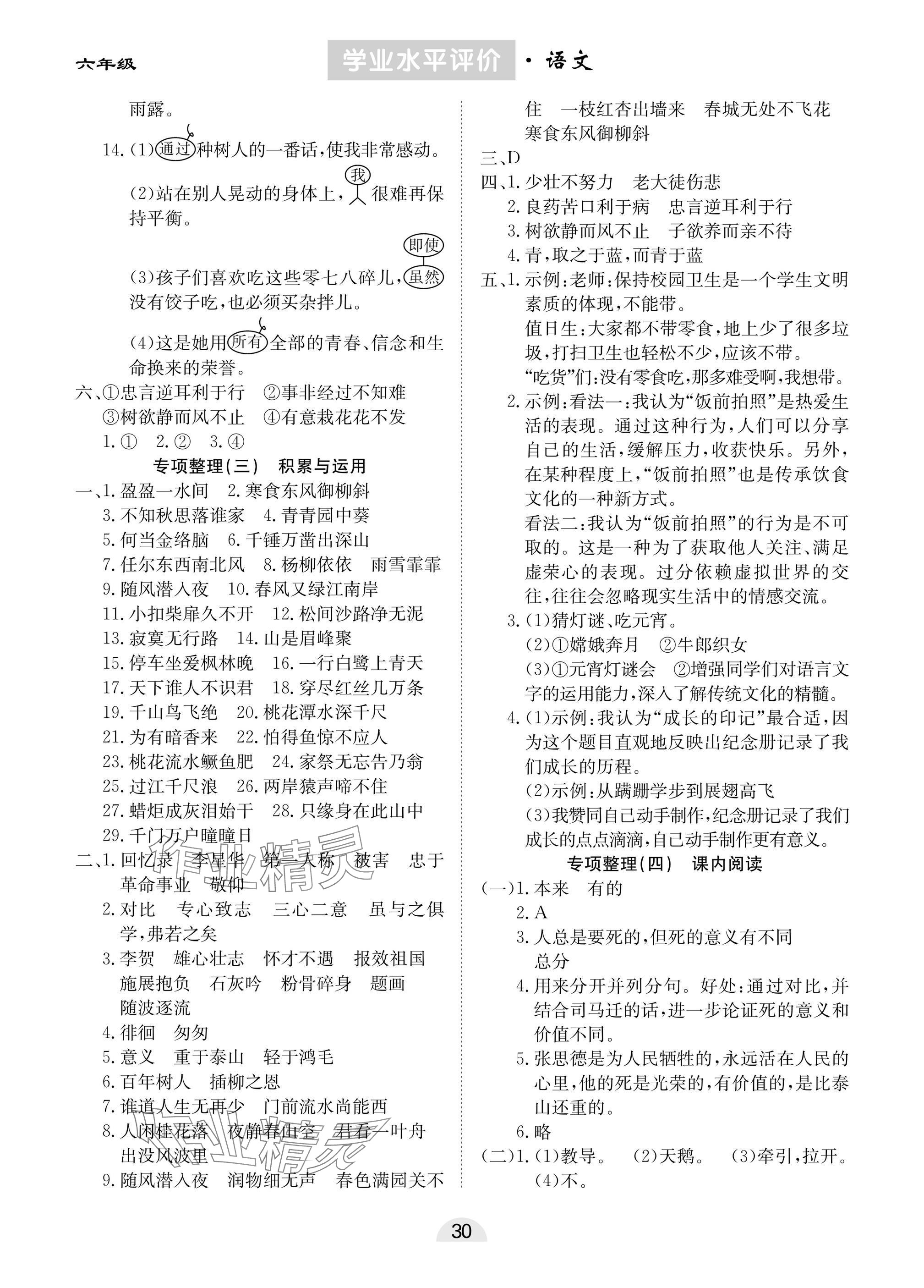 注:目前有些书本章节名称可能整理的还不是很完善,但都是按照顺序排列的,请同学们按照顺序仔细查找。练习册 2025年学业水平评价同步检测卷六年级语文下册人教版 答案主要是用来给同学们做完题方便对答案用的,请勿直接抄袭。