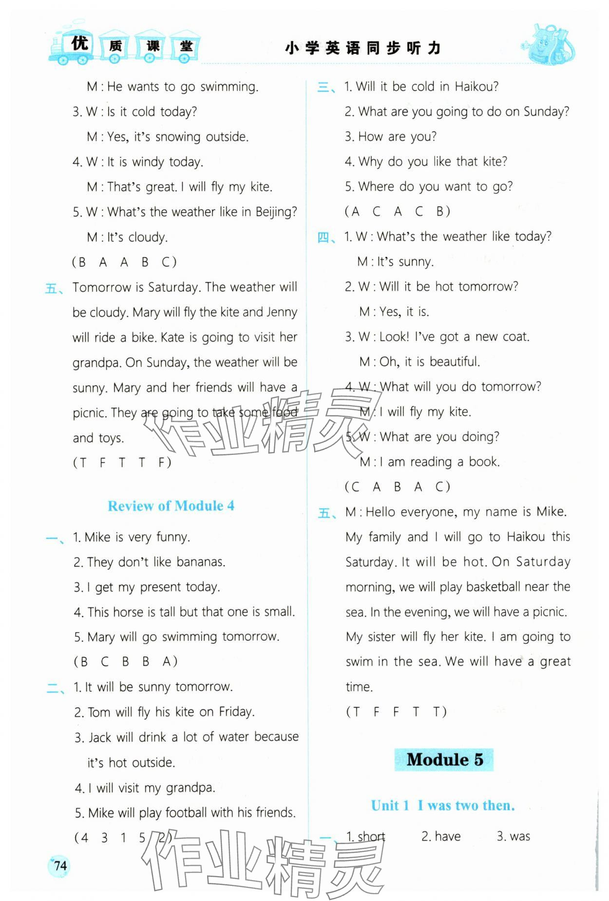 注:目前有些书本章节名称可能整理的还不是很完善,但都是按照顺序排列的,请同学们按照顺序仔细查找。练习册 2025年优质课堂小学英语同步听力四年级英语下册外研版 答案主要是用来给同学们做完题方便对答案用的,请勿直接抄袭。