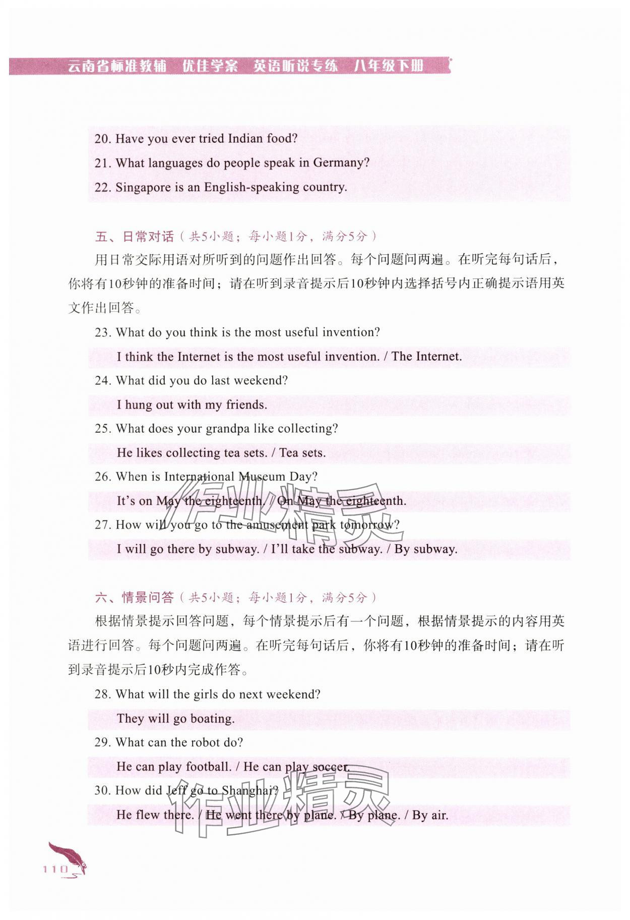 注:目前有些书本章节名称可能整理的还不是很完善,但都是按照顺序排列的,请同学们按照顺序仔细查找。练习册 2025年云南省标准教辅优佳学案八年级英语听说专练下册人教版 答案主要是用来给同学们做完题方便对答案用的,请勿直接抄袭。